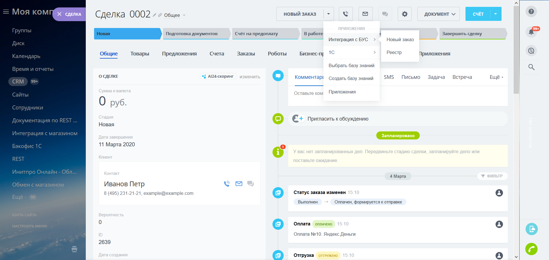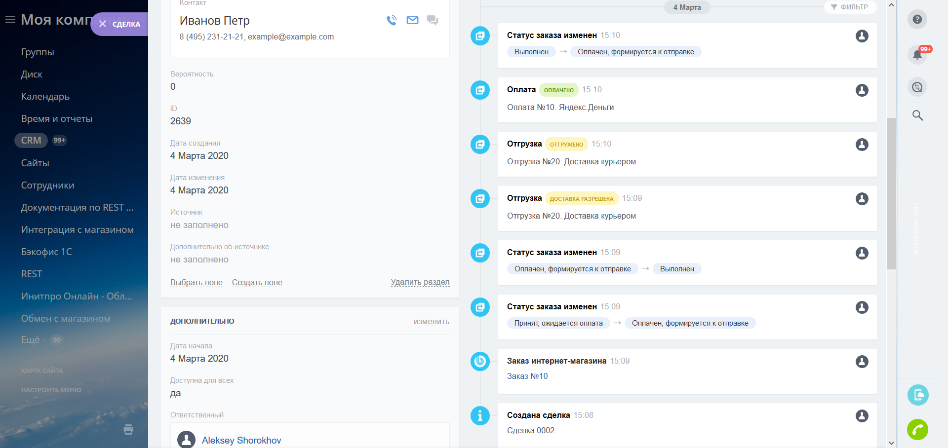 Вы можете быстро управлять продажами, обладая полной информацией о происходящем прямо в карточке сделки: статусы, отгрузки и оплаты заказов отображаются в таймлайне в реальном времени.