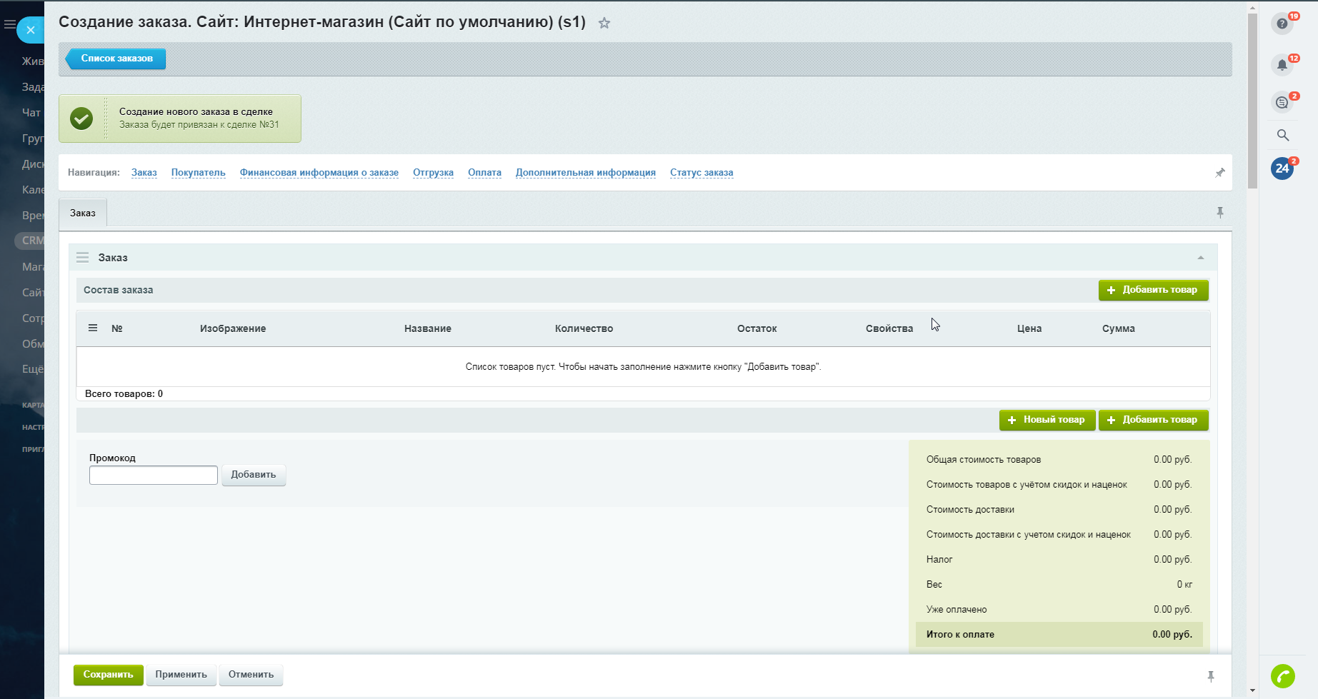 Вам позвонил клиент, который хочет сделать новый заказ? Вы можете в режиме телефонного звонка сформировать заказ, связанный со сделкой в Битрикс24. Создайте новую сделку, не привязывая её ни к какому клиенту, нажмите "Новый заказ" и, в открывшемся слайдере, заполните данные клиента и параметры его заказа в интернет-магазине. После сохранения заказа, он автоматически появится в таймлайне сделки, а контактные данные клиента будут прикреплены к сделке в виде связанного контакта или компании.