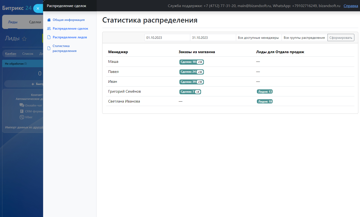 - Сбор статистики распределения по менеджерам в разрезе групп. Сделки и лиды, распределённые по принципу касания, считаются отдельно;