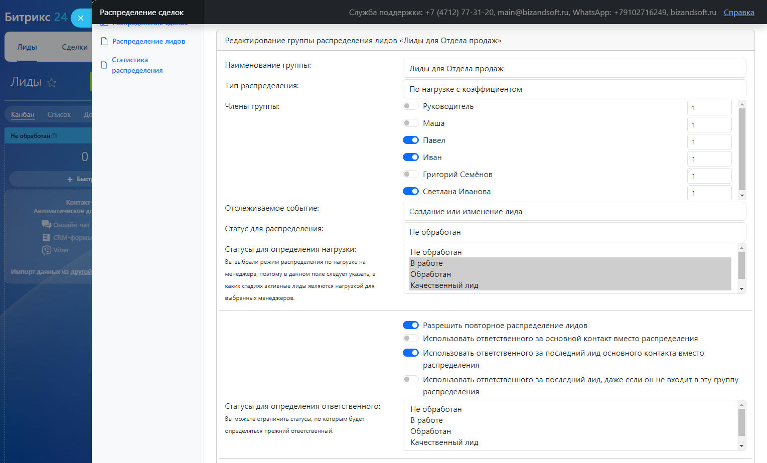 - Распределение по нагрузке с учётом как всех сделок/лидов менеджера, так и с выделением отдельных статусов для просчёта нагрузки;