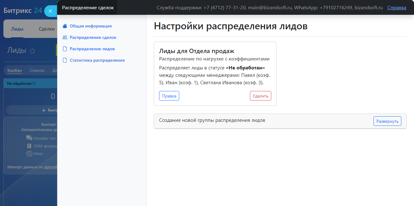 - Распределение «своих» лидов и сделок по принципу существующего ответственного за привязанный контакт или по наличию других сделок или лидов у данного контакта (с возможностью ограничения статусов и списка менеджеров);