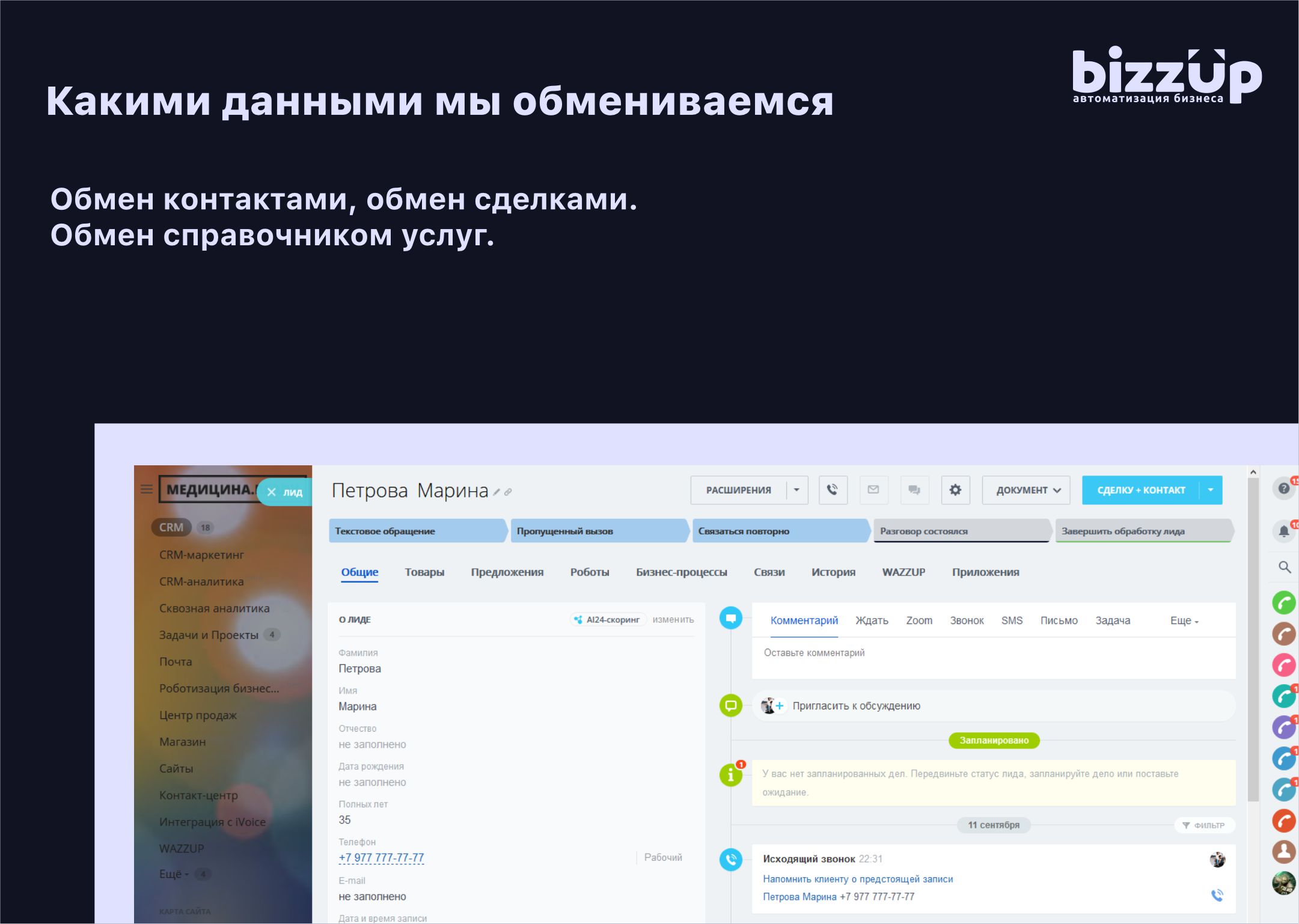 Контактная информация пациента передается в Битрикс24 (мы не передаем персональные данные первой категории), если пациент пришел к нам впервые. Также закрывается лид, который был создан при звонке пациента с сохранением данных в контакте об источнике лида