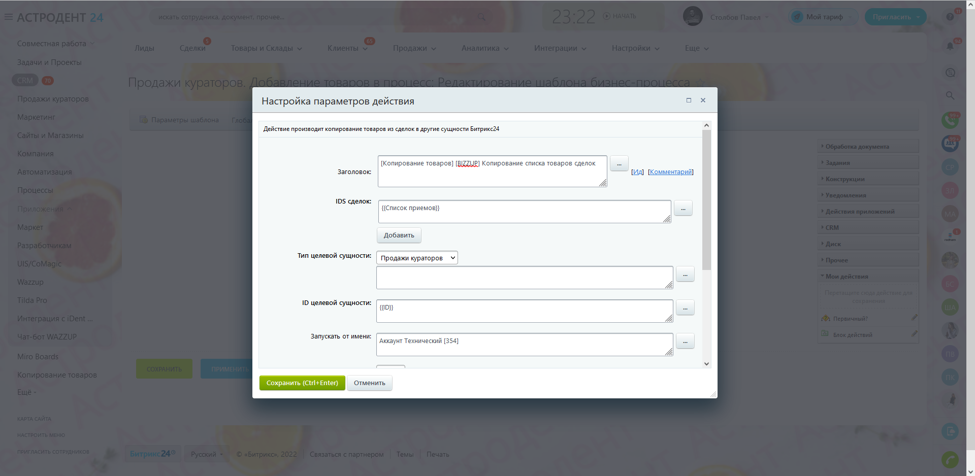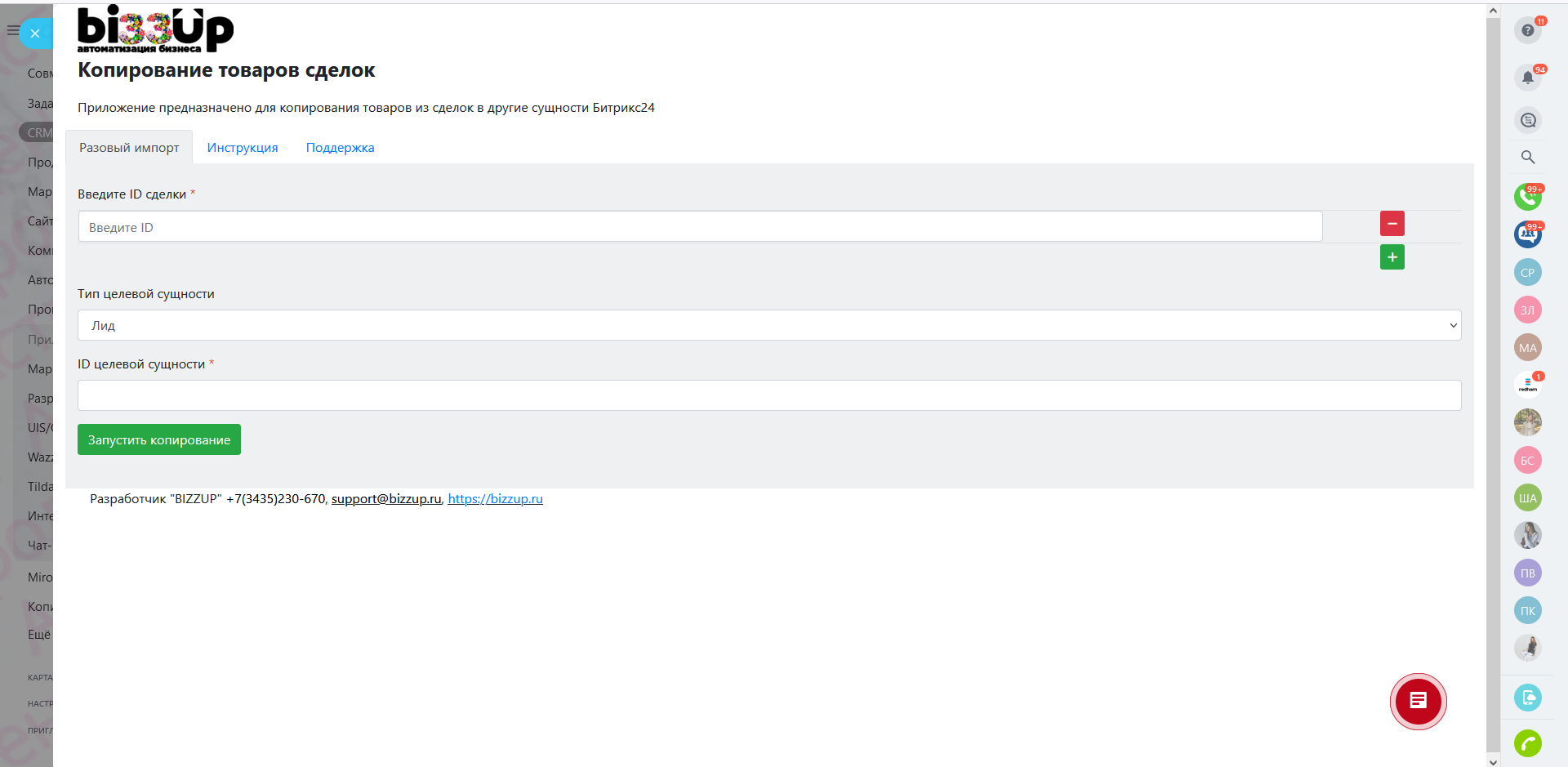 Приложение копирует товары из одной или нескольких сделок в выбранную сущность, в том числе в смарт-процессы.