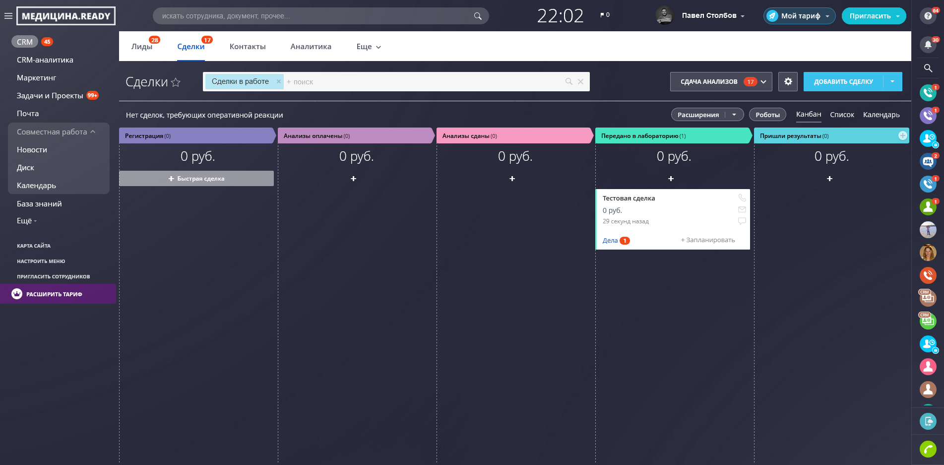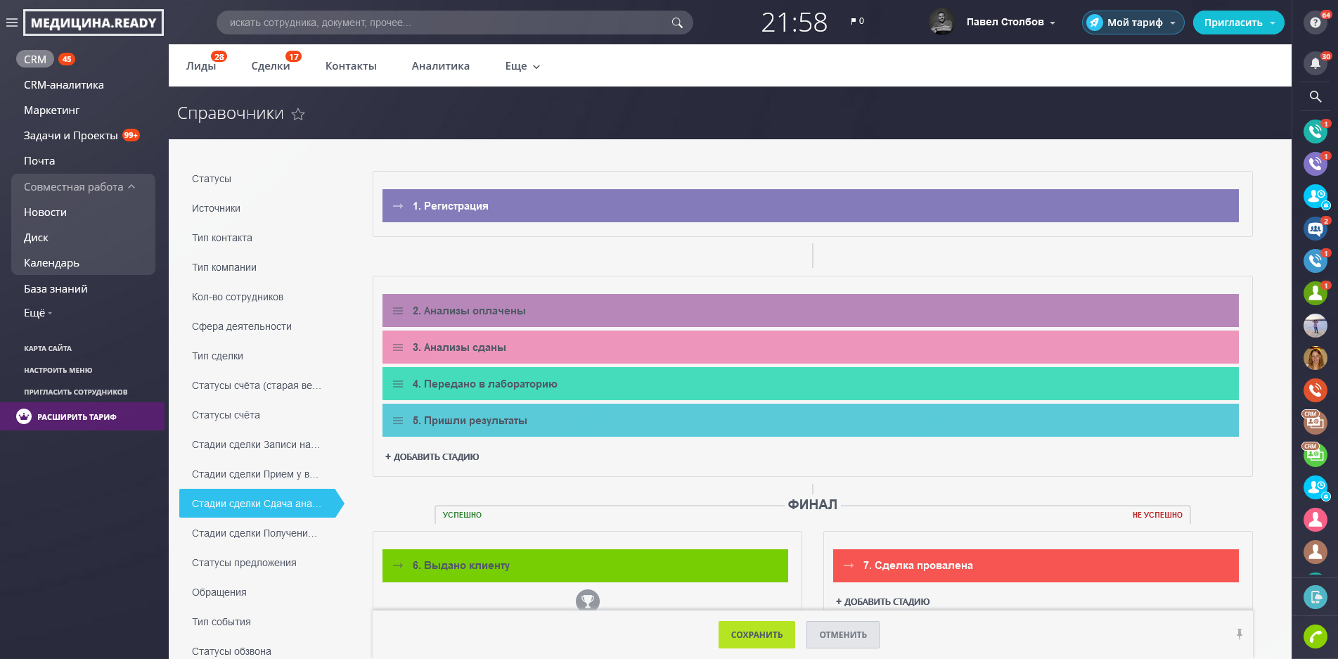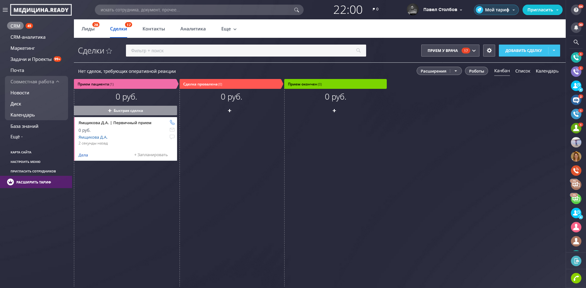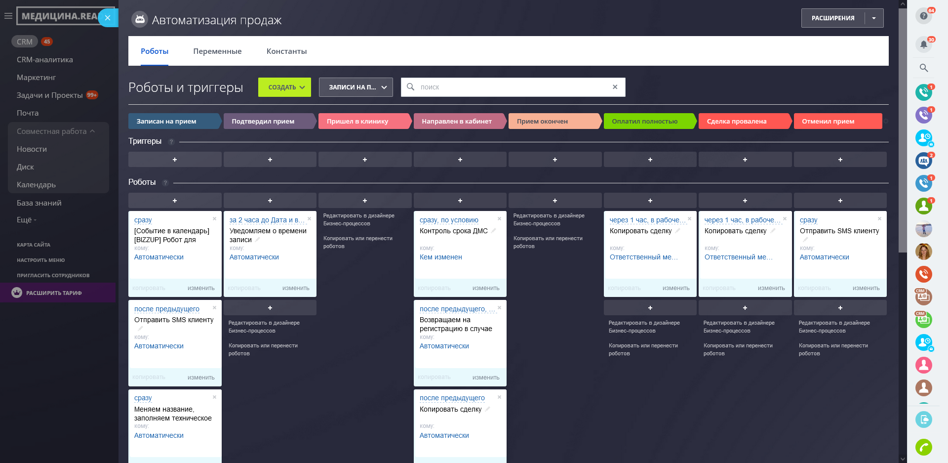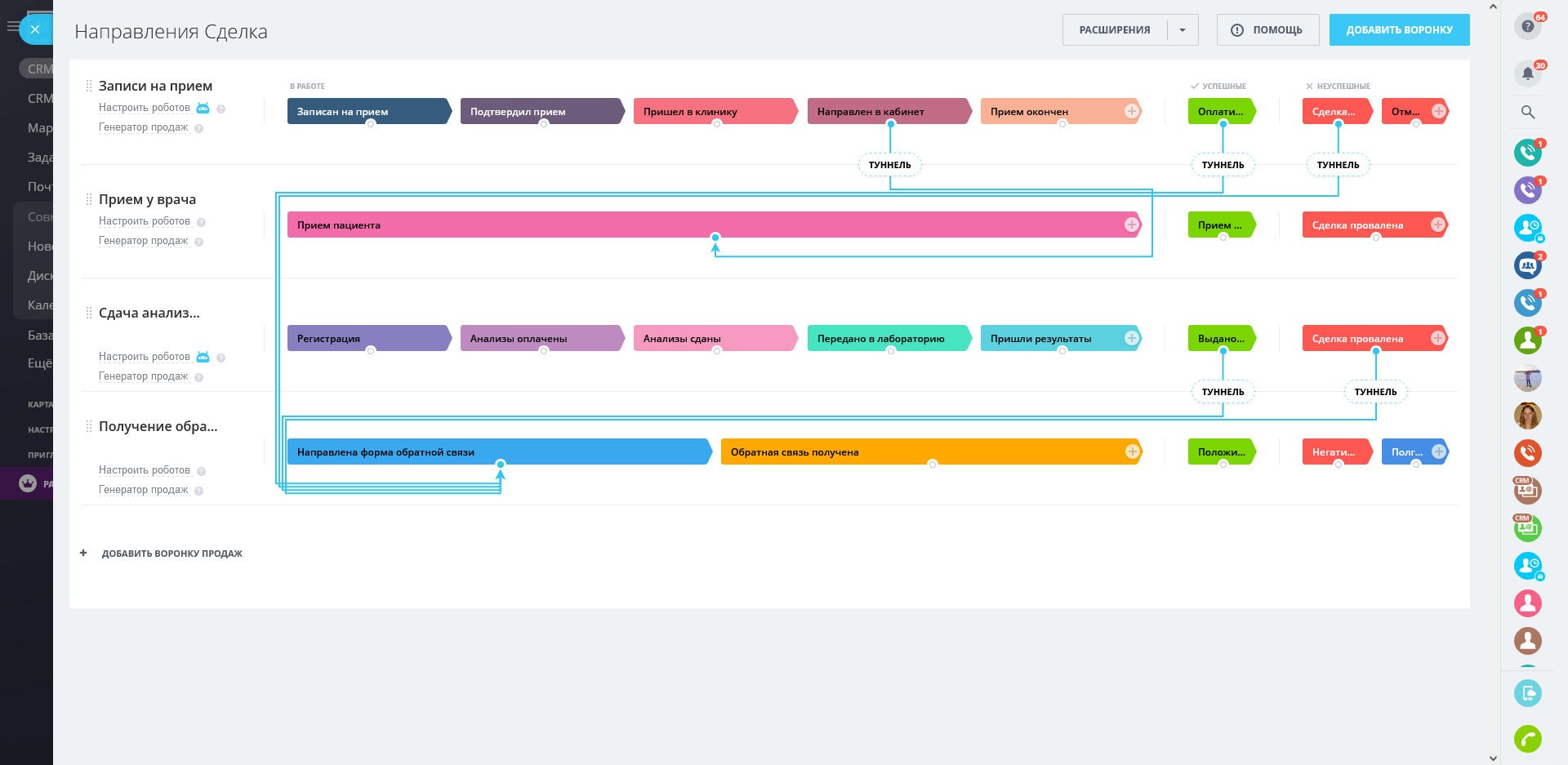 ГОТОВАЯ CRM ДЛЯ МЕДИЦИНСКИХ ЦЕНТРОВ И СТОМАТОЛОГИЙ Мы подготовили для вас сценарий работы, построенный на опыте общения с собственниками и коммерческими директорами более 30 медицинских учреждений. Подготовили решение, которое позволит увеличить эффективность работы персонала в 1,5 - 3 раза уже через несколько дней. Мы предусмотрели для вас следующие сценарии работы: запись пациентов на прием, контроль явки пациента на прием, регистрация пациента на ресепшен, приём врача, сдача анализов и сбор обратной связи!