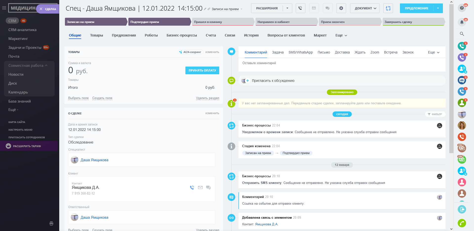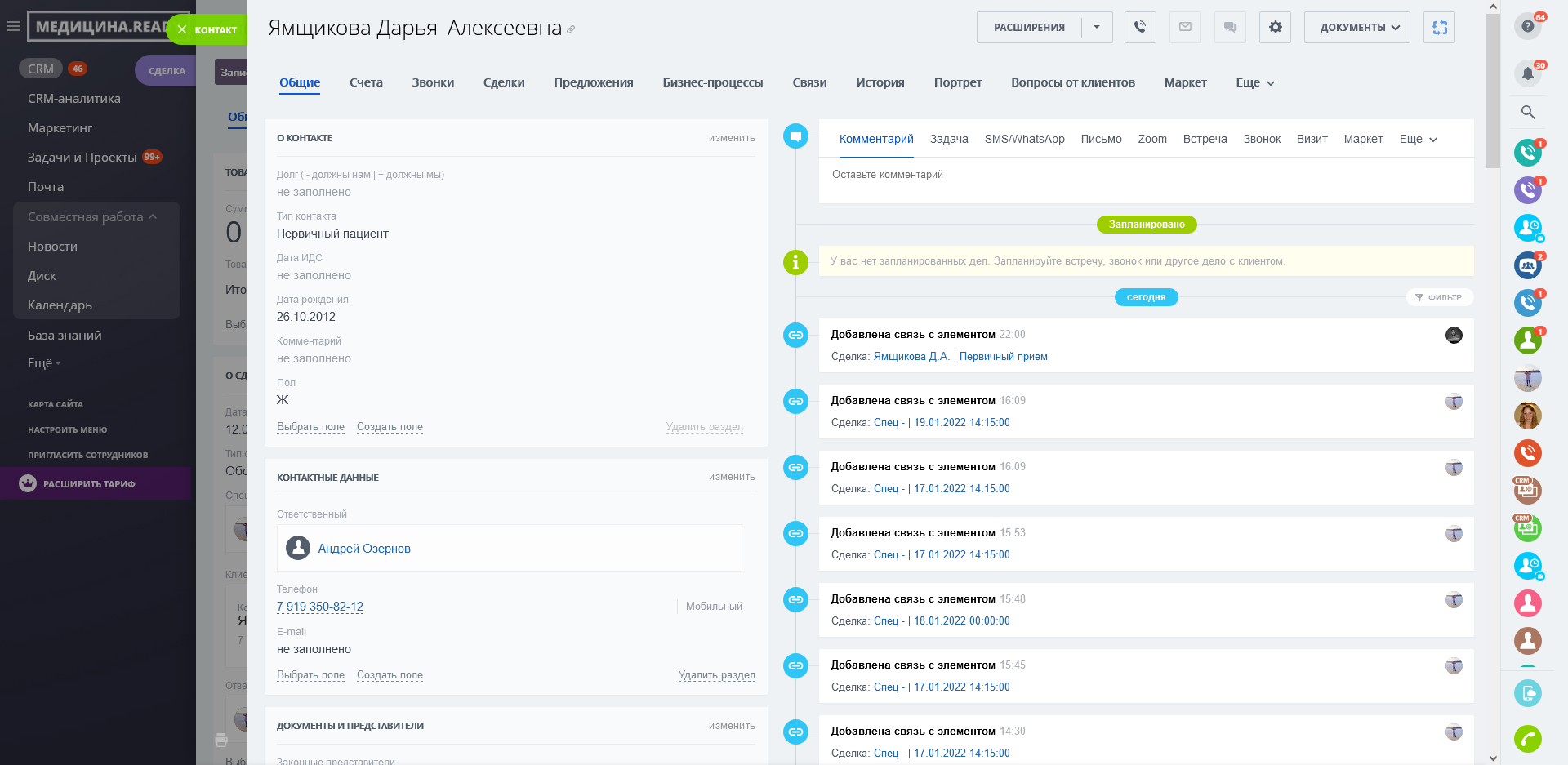 - Контакты и компании Битрикс24. Получаем ID сделок - для получения информации о приемах пациента