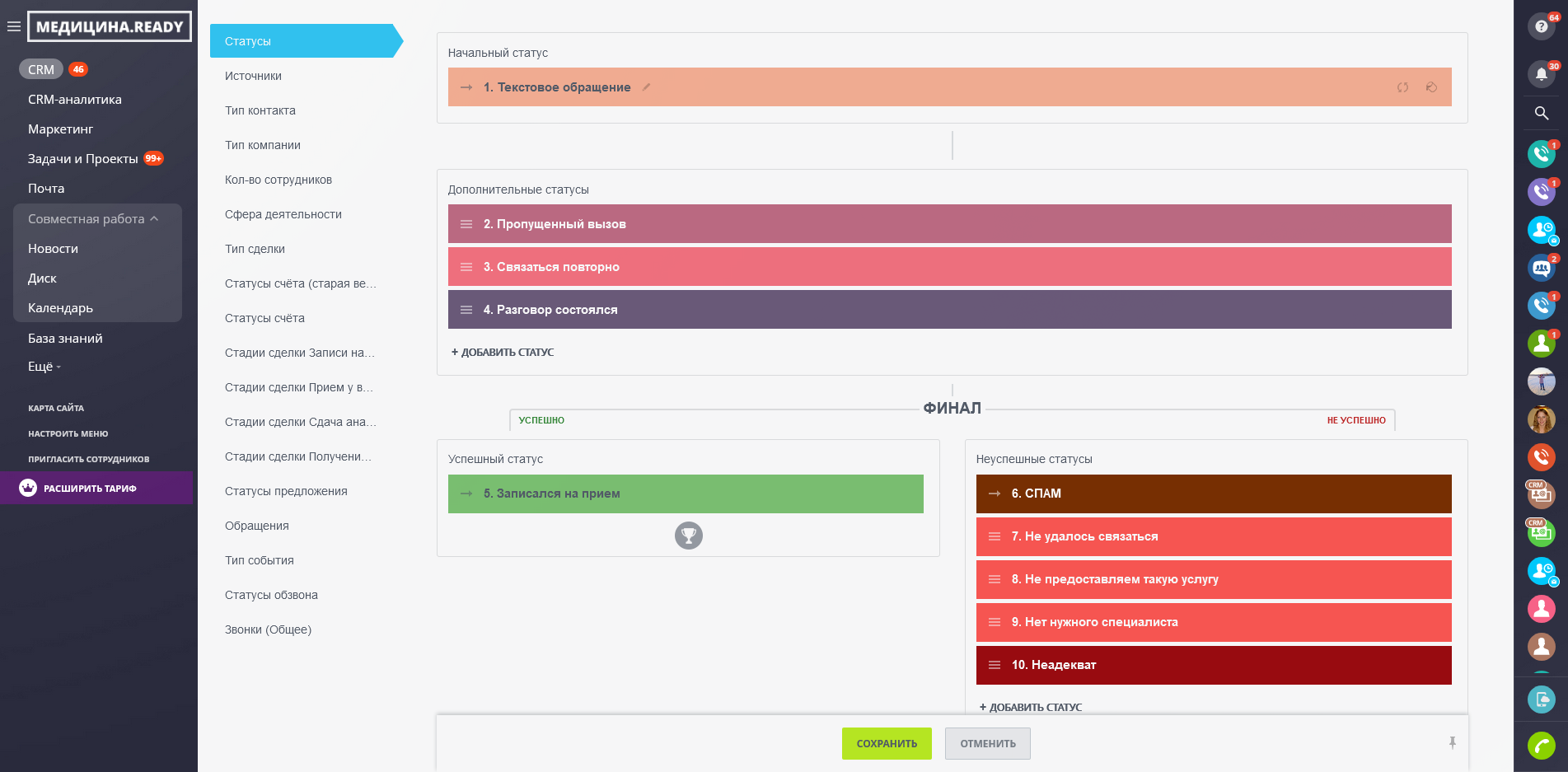 Дополнительно потребуется настройка телефонии UIS в приложении "Телефония UIS + сквозная аналитика CoMagic", подробно о настройке в инструкциях по настройке решения Медицина.Ready. Понадобится подключение и заключение договора в л/к UIS по ссылке.