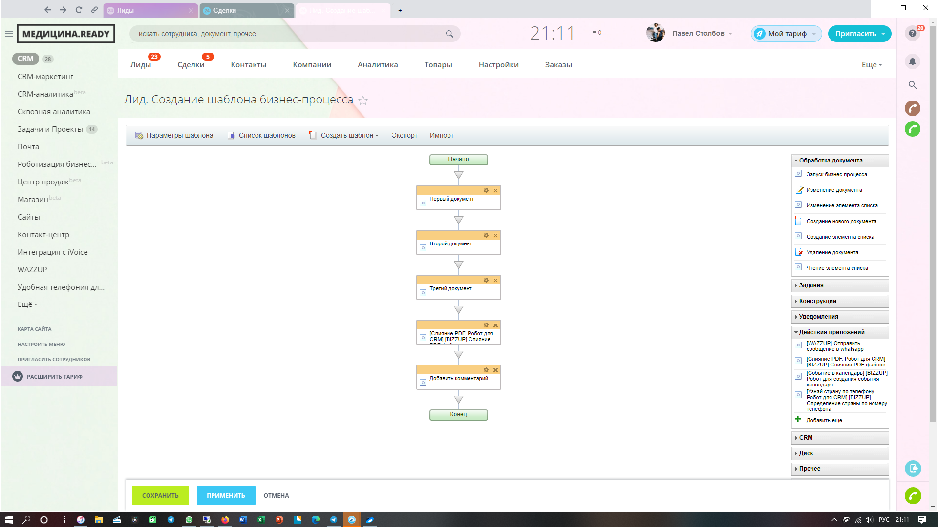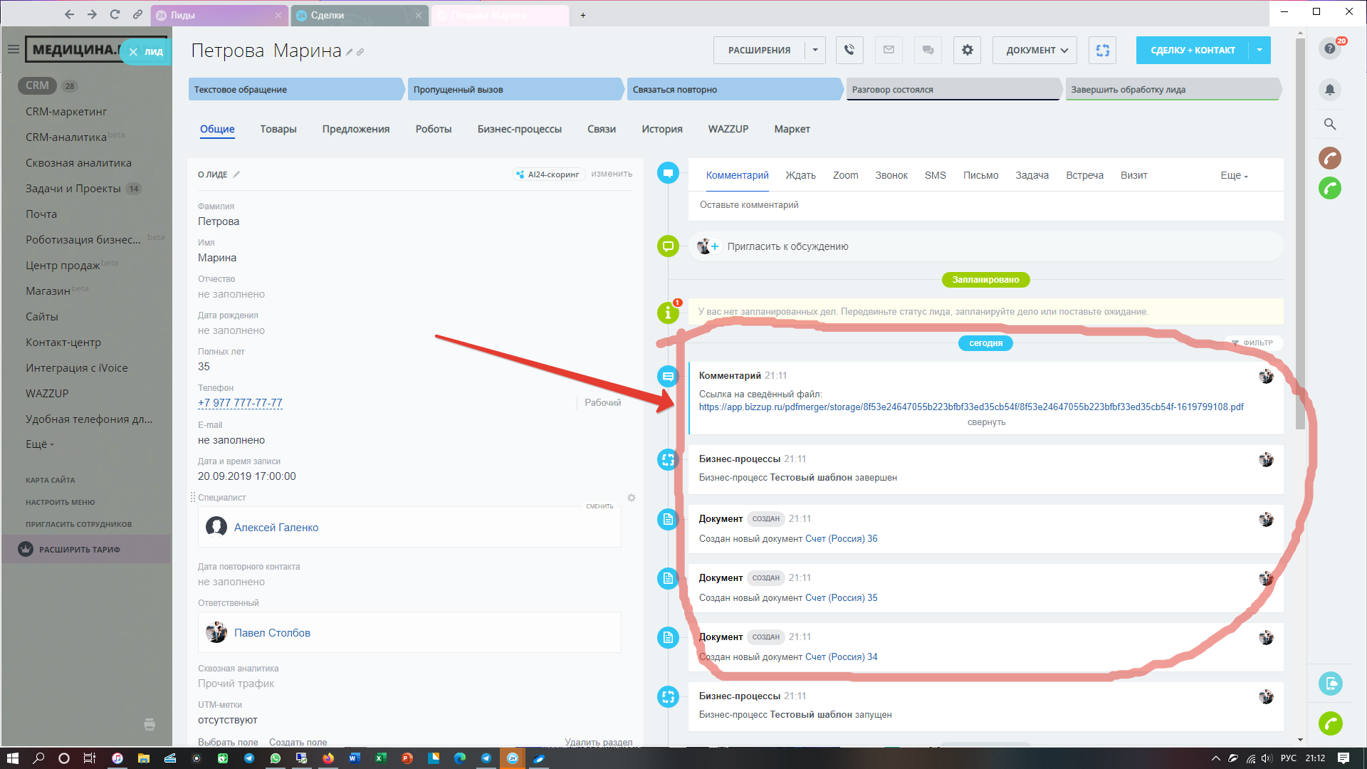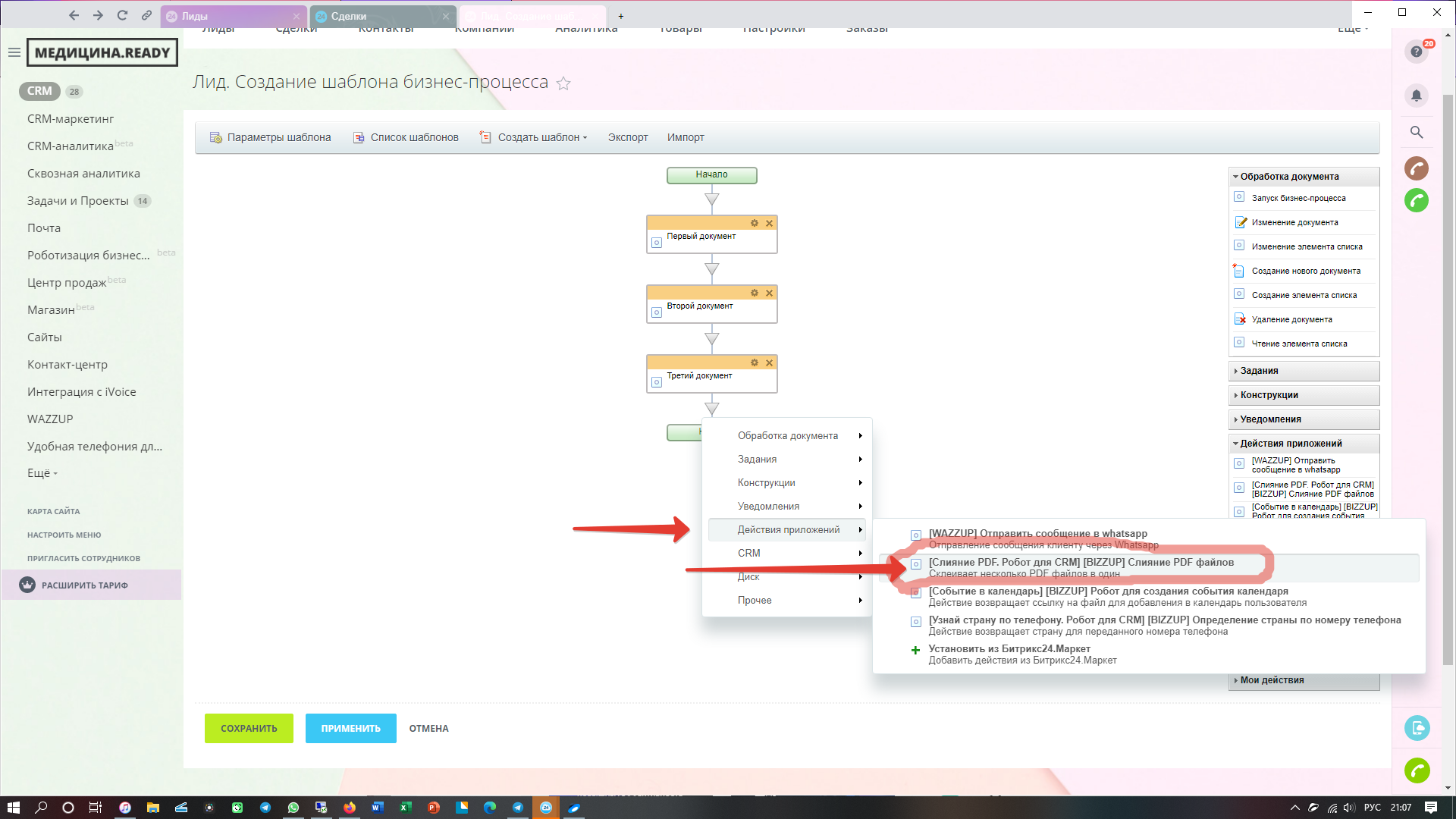 Действие бизнес-процесса (активити), робот, который объединяет несколько PDF (ПДФ) файлов в один и даёт ссылку на прямое открытие файла для скачивания или печати. Полезно, если в CRM формируется пакет документов, который вы не хотите скачивать или печатать по отдельности.