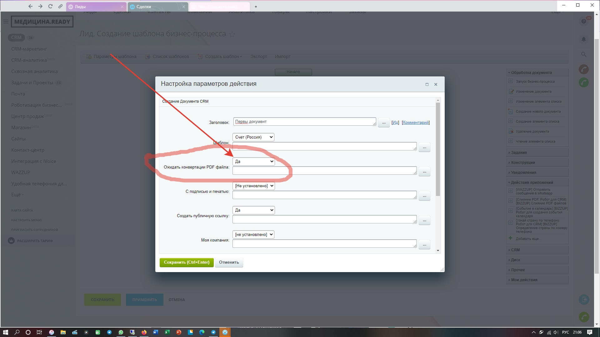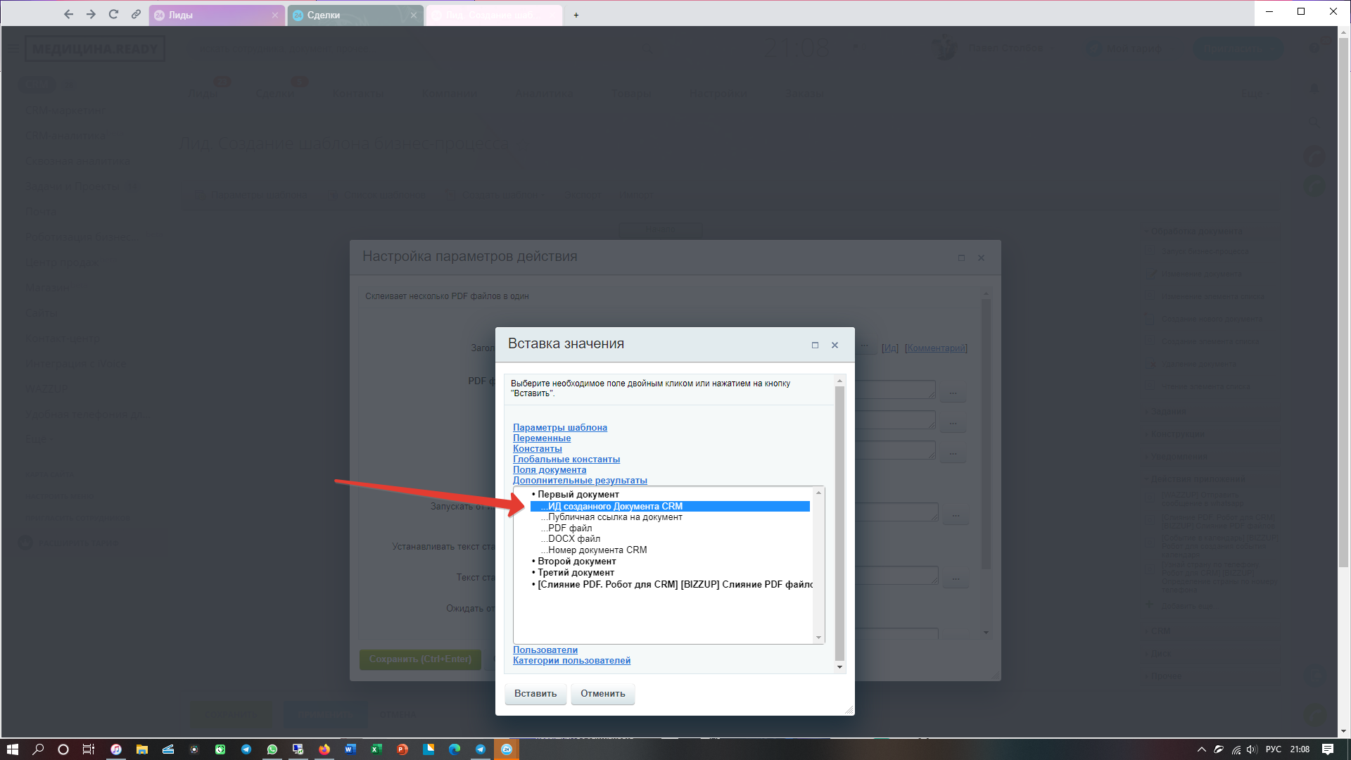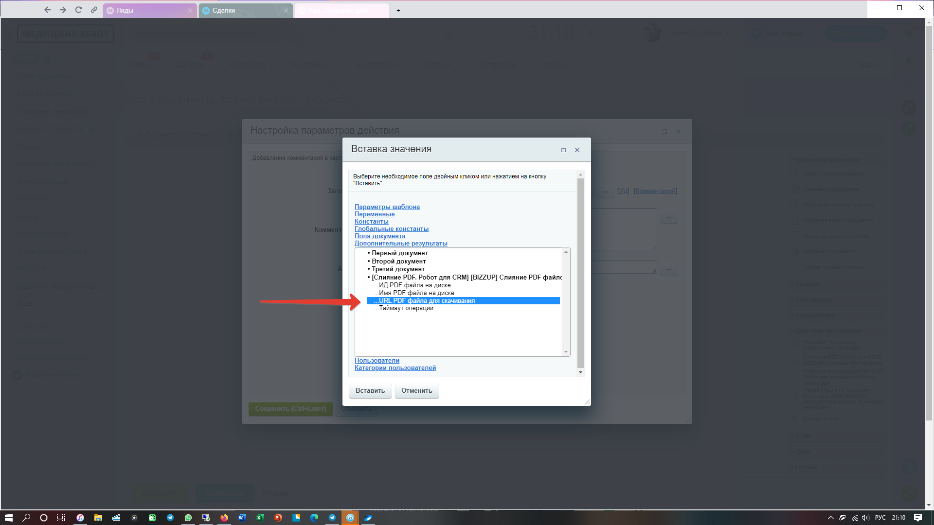 - В поле "PDF файл" действия необходимо вписать ID (ИД) документов, созданных генератором документов или ID файла на диске