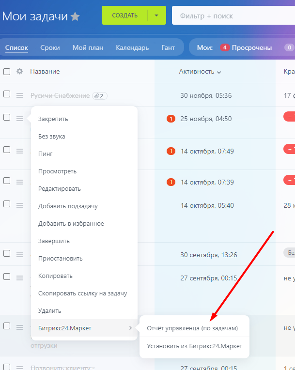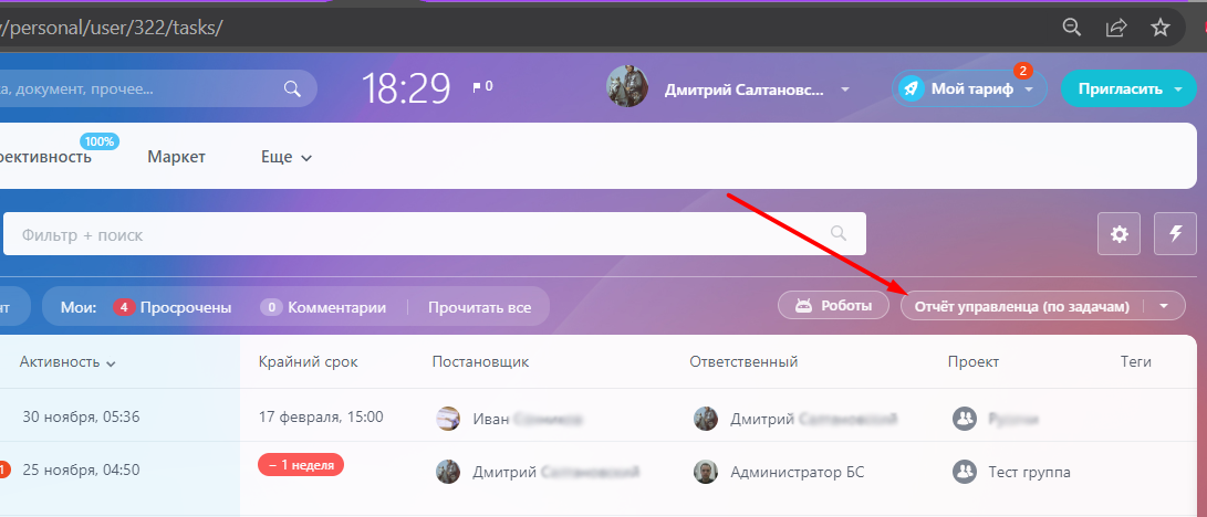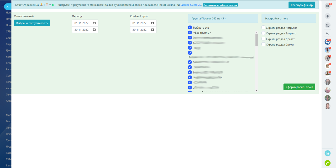 Отчет Управленца - это наглядный, полный отчет о состоянии задач по вашим сотрудникам