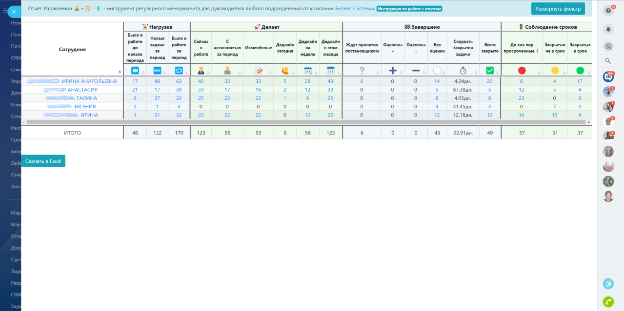 Крутые показатели: "Нагрузка", "Скорость закрытия задач", "До сих пор просроченные задачи", и многие другие