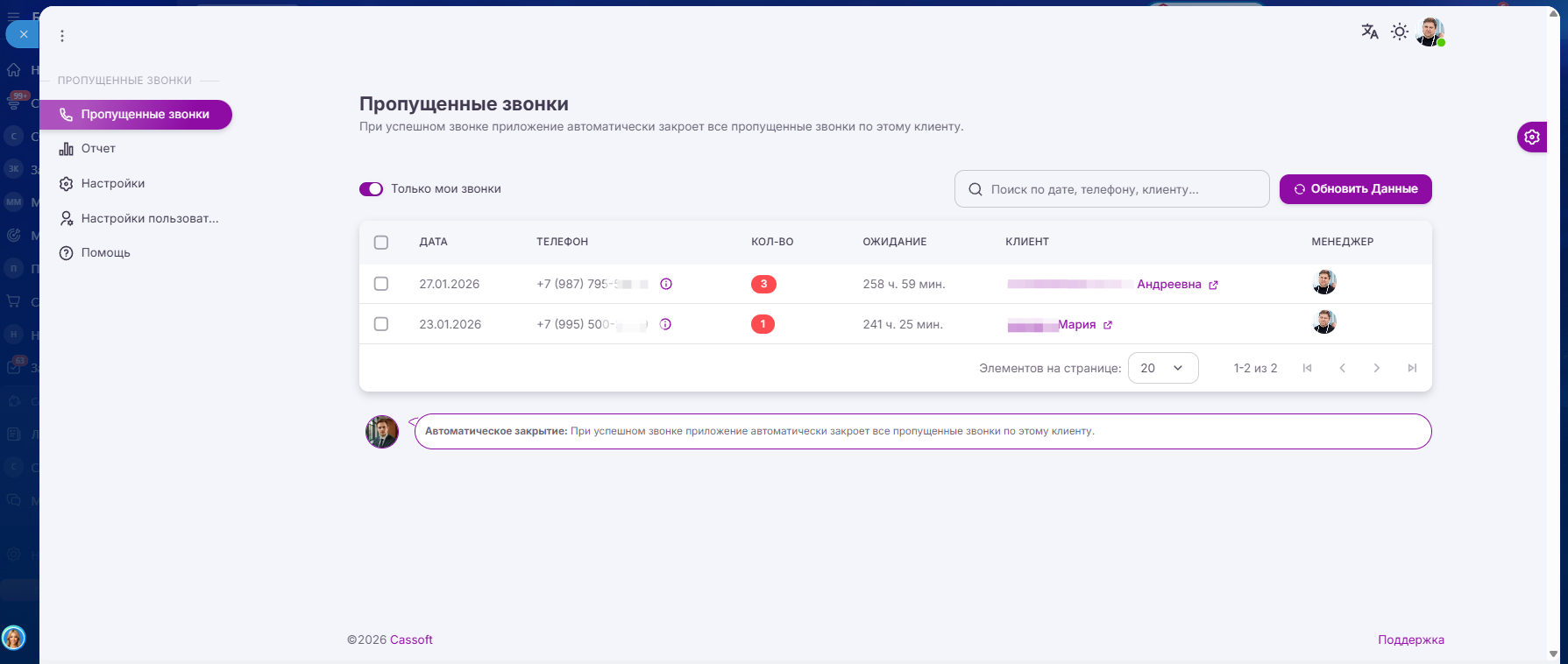 Закрытие пропущенных звонков