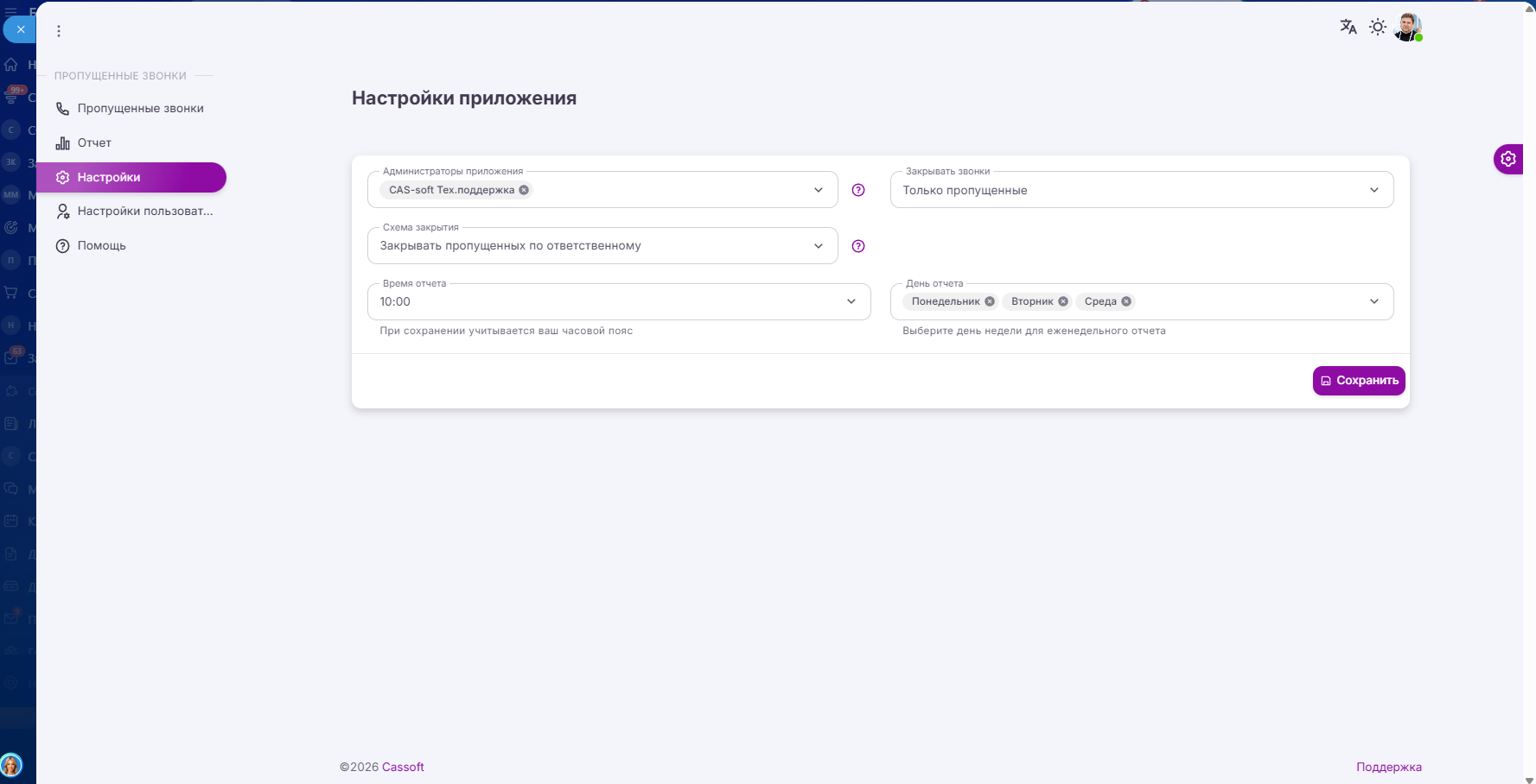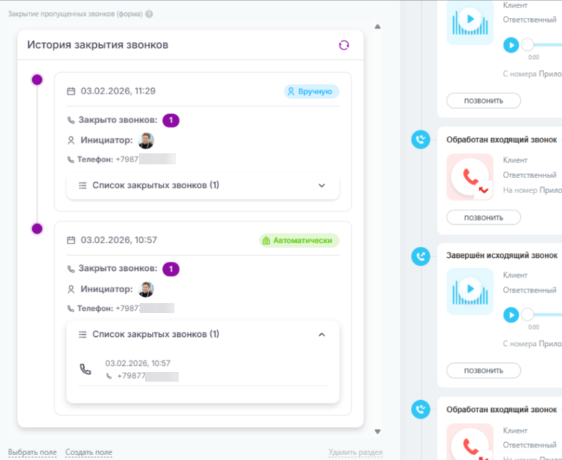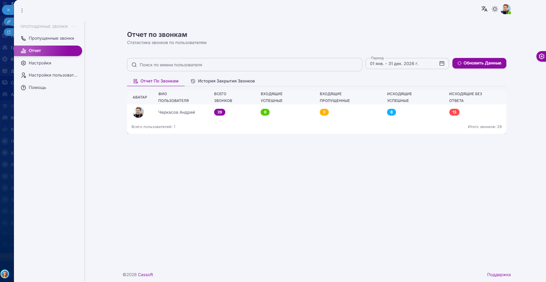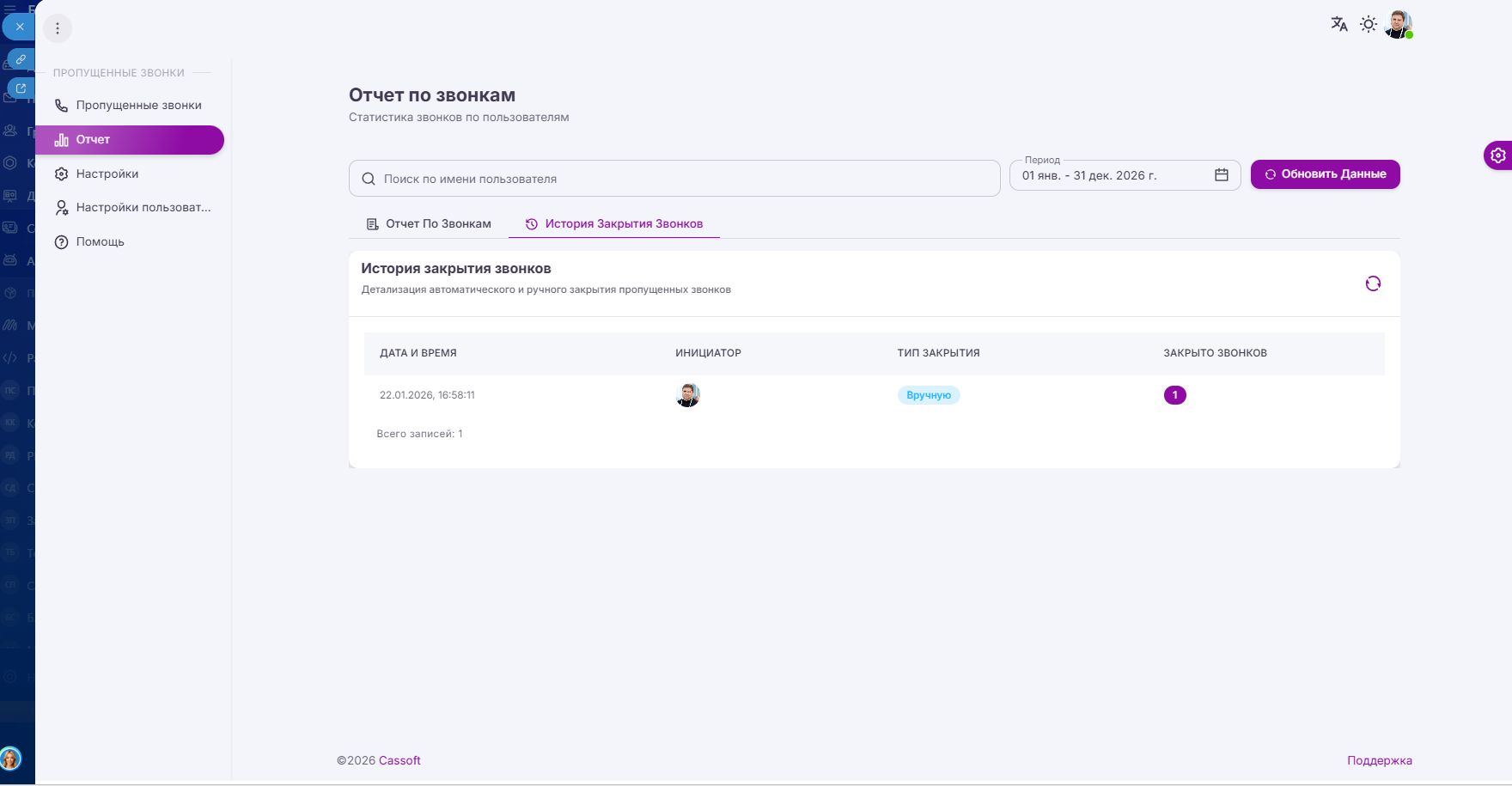 Появились отчеты по звонкам и отчет по истории закрытия пропущенных звонков.