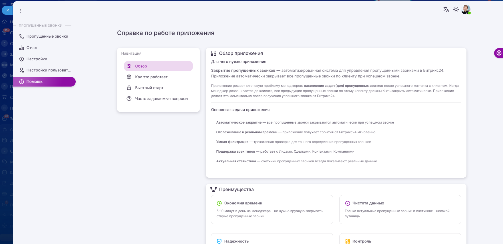 Приложение решает проблему большого количества пропущенных звонков, которые менеджеры не замечают и не реагируют на них. Приложение закрывает все пропущенные звонки по клиенту в случае успешного звонка во всех сущностях в Лидах, Сделках, Контактах и Компаниях, оставляя только актуальные.