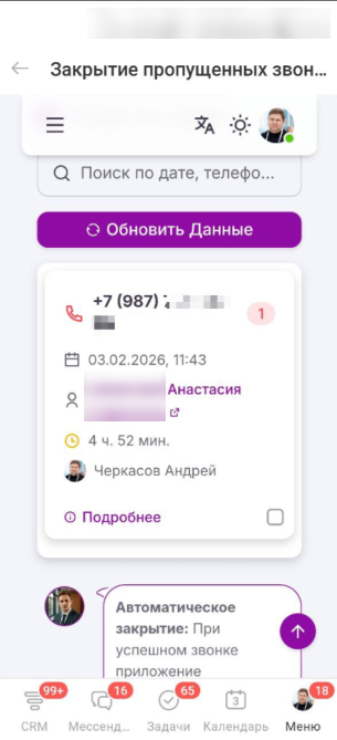 В компаниях, где менеджеры работают большее время вне офиса или на удаленке, отвечая на звонки клиентов с мобильного телефона, часто возникает проблема с большим количеством пропущенных звонков. Менеджеры не могут после удачного звонка сразу зайти в программу и закрыть активное событие "Пропущенный звонок".