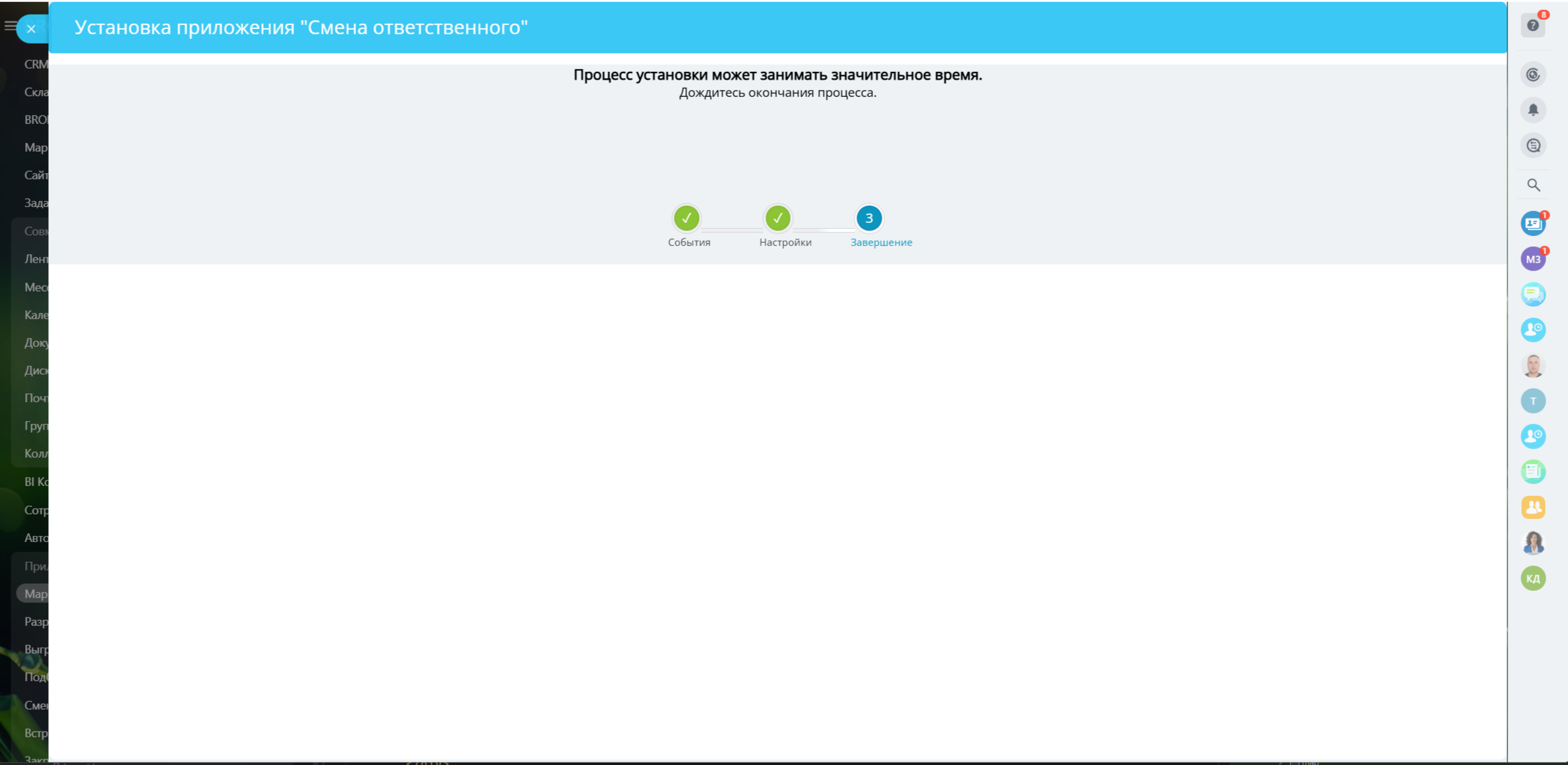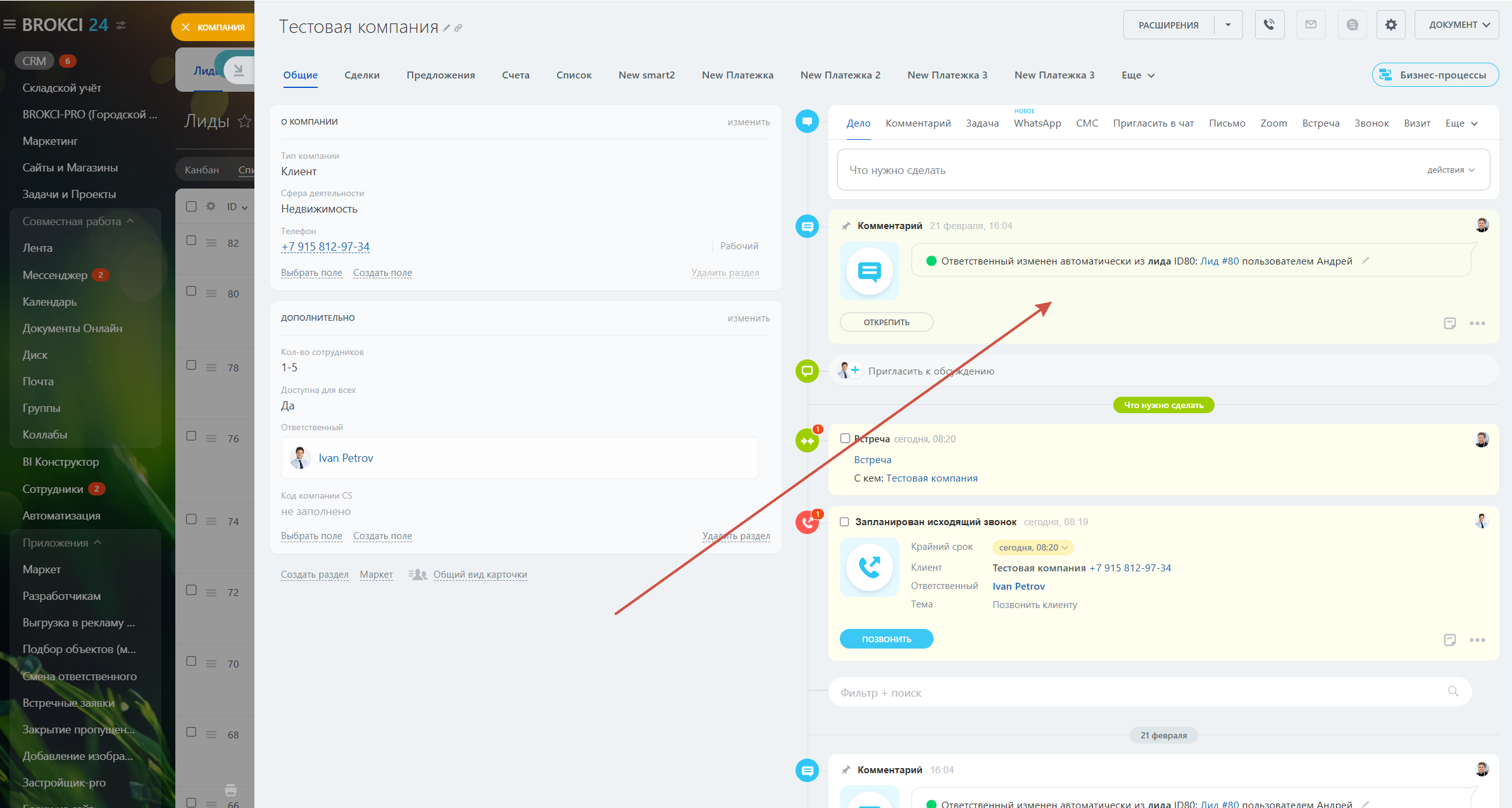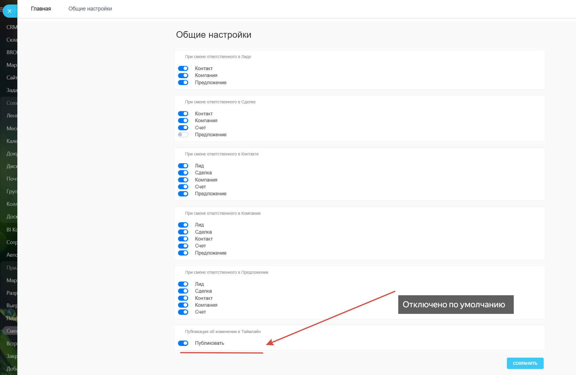 По результатам, если приложение меняет ответственного в любой сущности CRM, оставляется комментарий в Таймлайне о том из какой сущности был запущен процесс (По умолчанию отключено).
