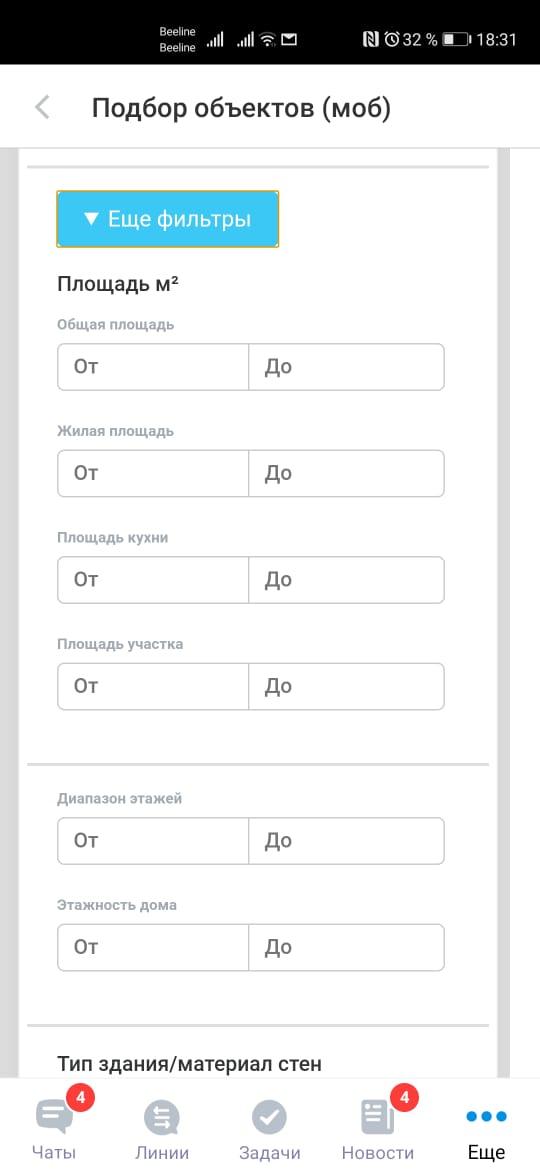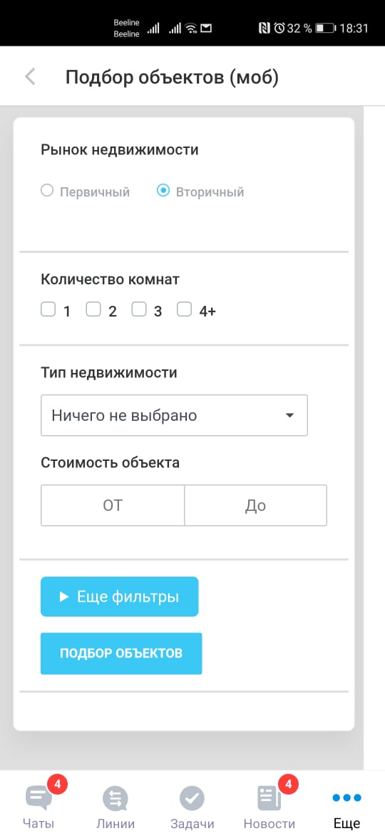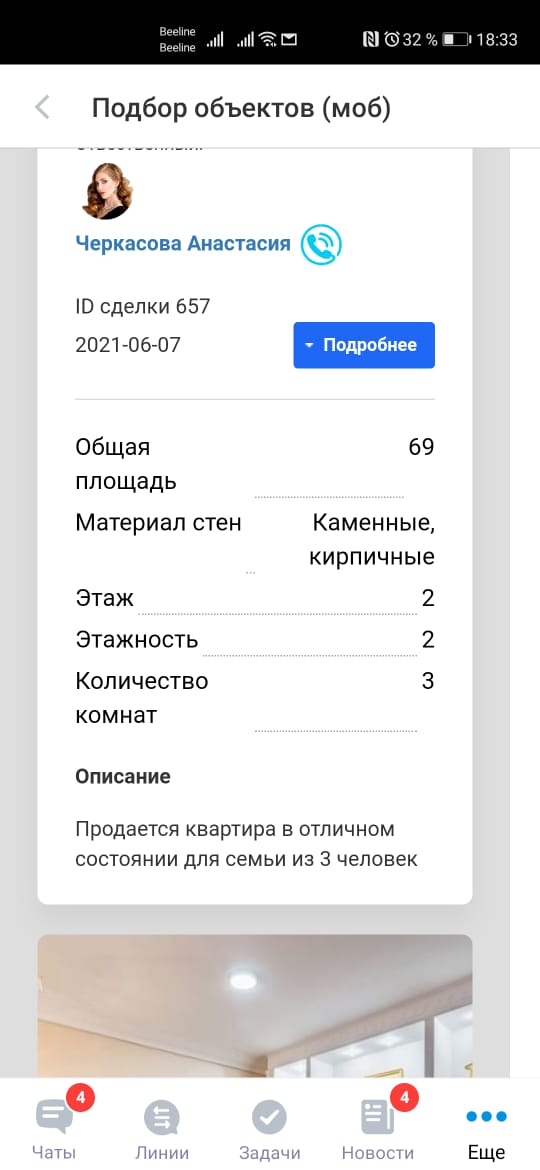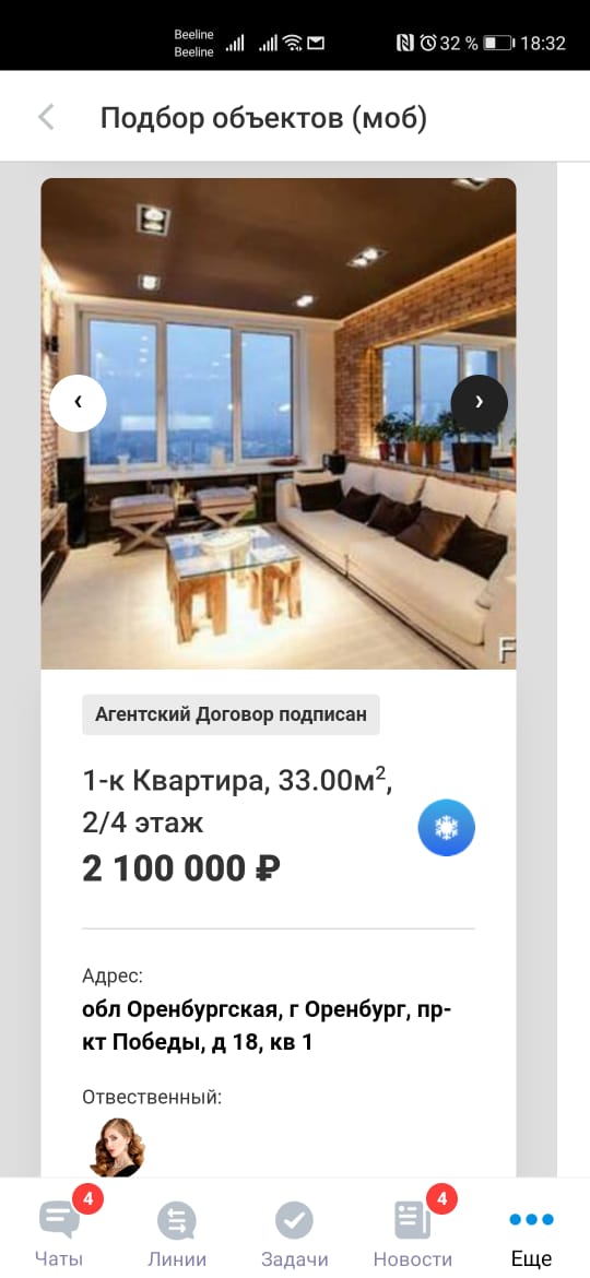 Приложение позволяет выбирать объект недвижимости из общей базы компании прямо в мобильном приложении Битрикс24, находясь на встрече с клиентом.