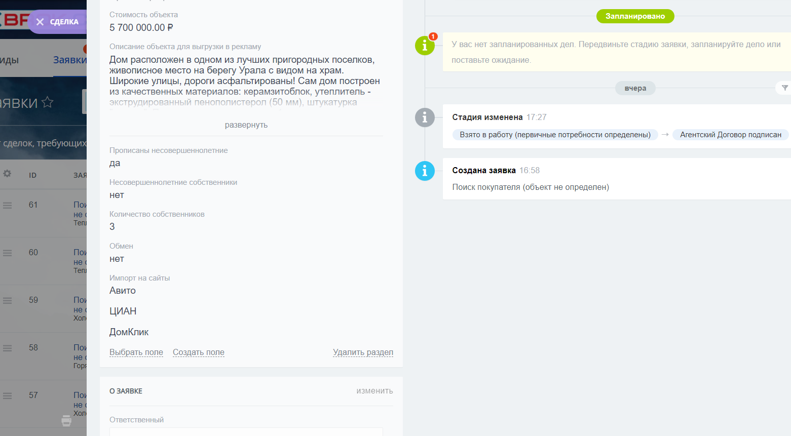 - с помощью нашего решения каждый сотрудник будет вести список объектов недвижимость и контролировать выгрузку на основные порталы (Авито, ЦИАН, Яндекс, Дом Клик, Юла, Метр квадратный (ВТБ), свой сайт и др.) в один клик;