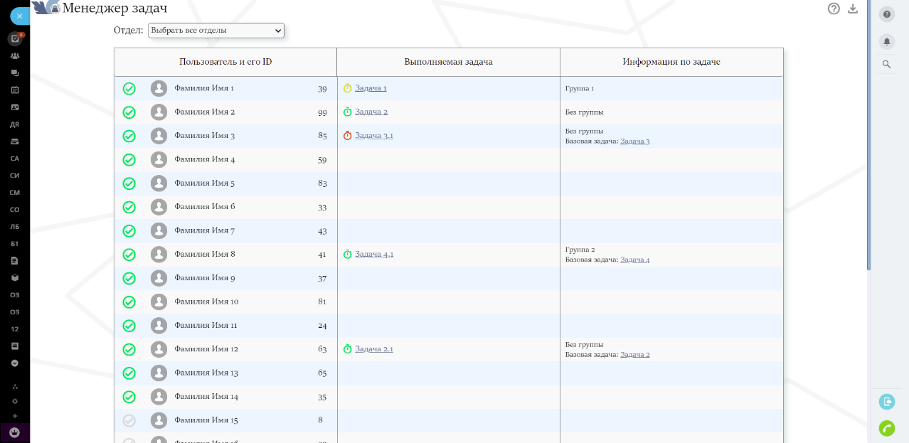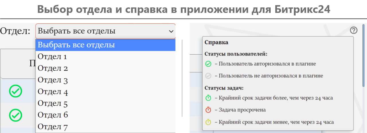 - Для удобства использования приложения имеется фильтрация сотрудников по отделам компании, а также справка по иконкам статусов пользователей и выполняемых задач.