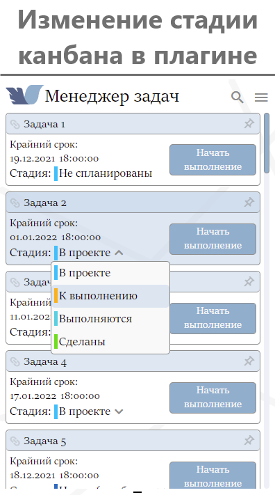 - Для поддержания актуальности стадии выполнения задачи, пользователь может просматривать и изменять стадию канбана внутри плагина. Данная функция опциональна, можно включить/выключить её в меню расширения.