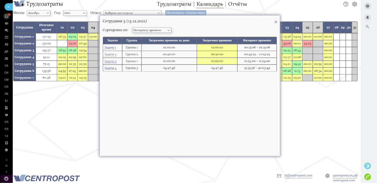 - Для того, чтобы получить подробную статистику рабочего дня сотрудника, Вы можете нажать на ячейку календарного дня с внесённым временем. Для удобства можно отсортировать задачи по дате создания или по интервалу времени, в который выполнялась задача.
