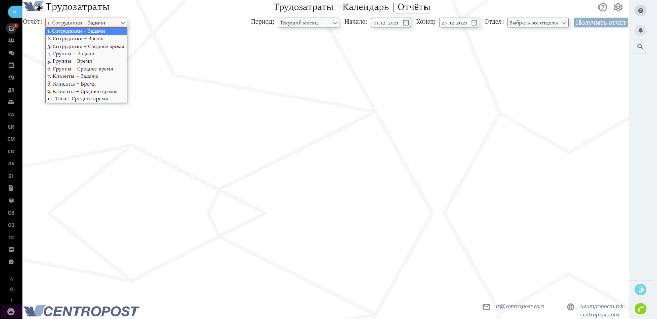 - Также Вы можете выбрать период, за который необходимо получить отчёт и отдел компании.