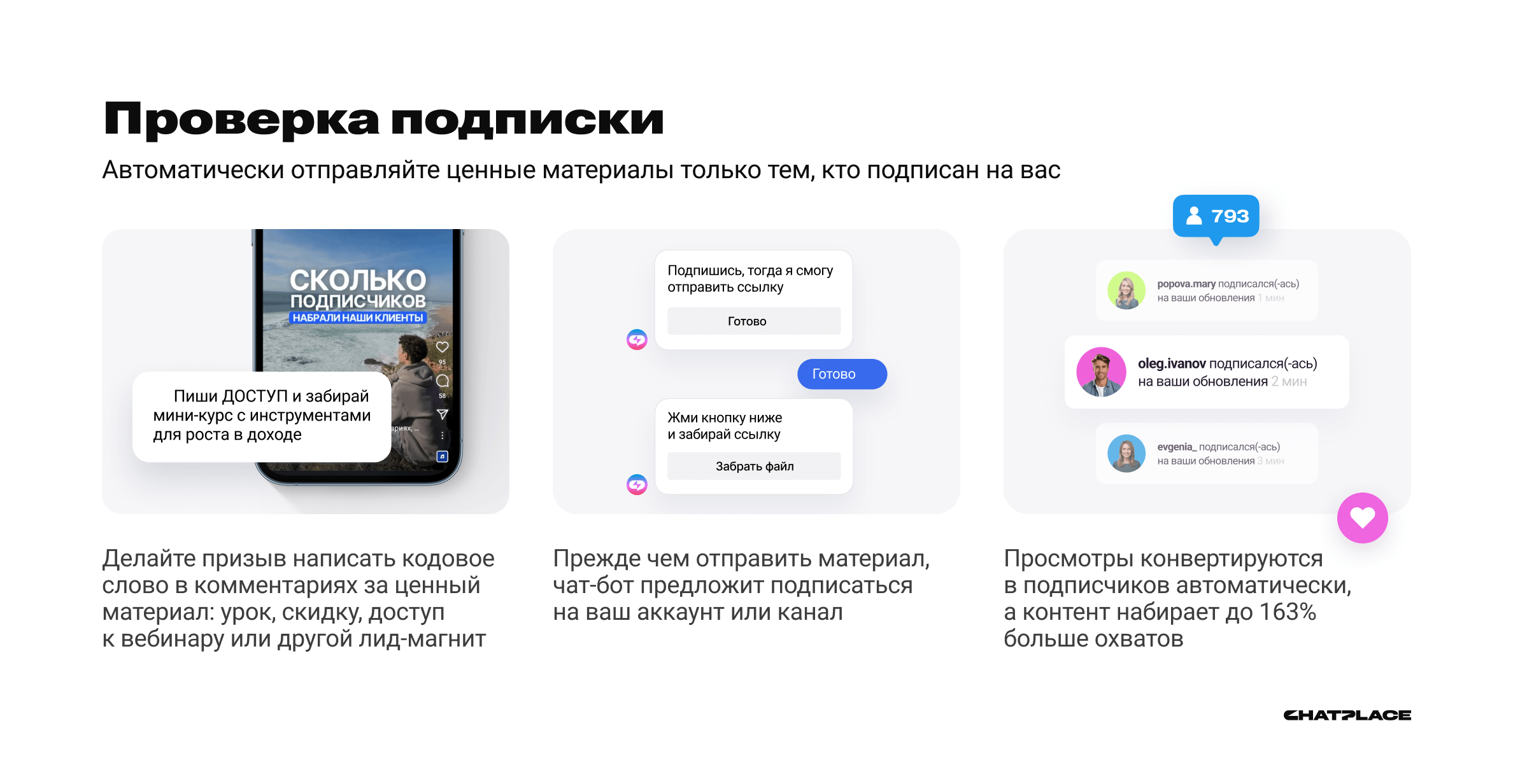 1. Чат-боты с проверкой подписки: Получайте на 163% больше охватов и конвертируйте просмотры в подписчиков.