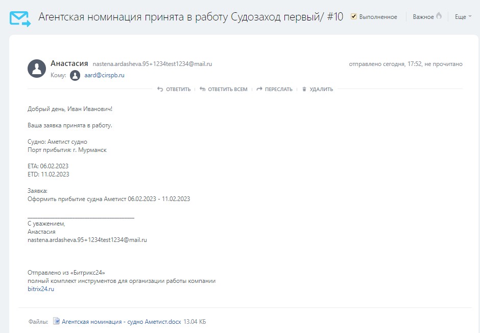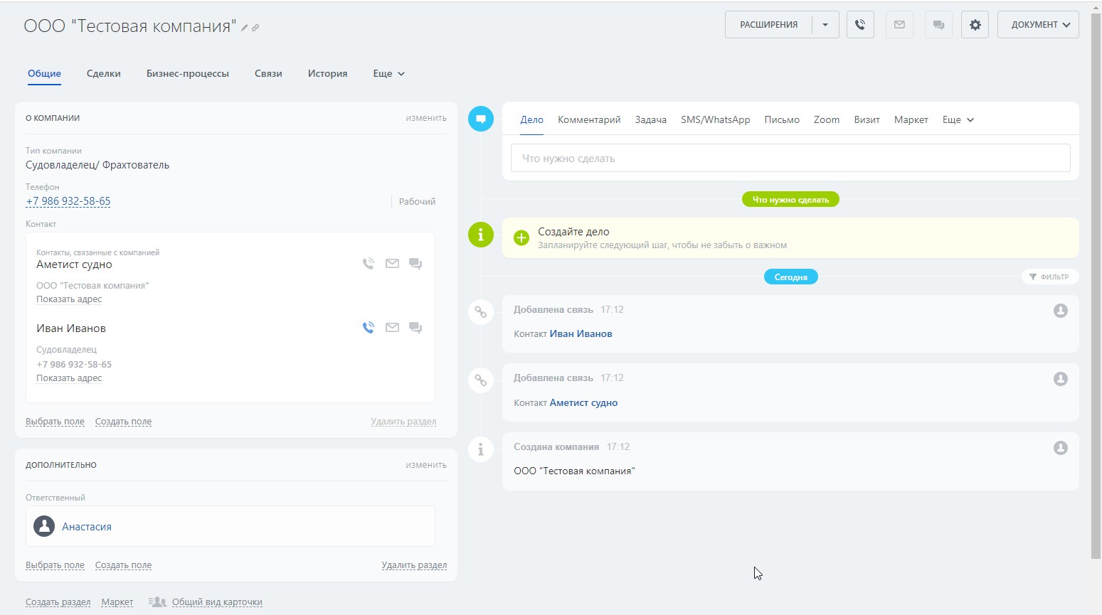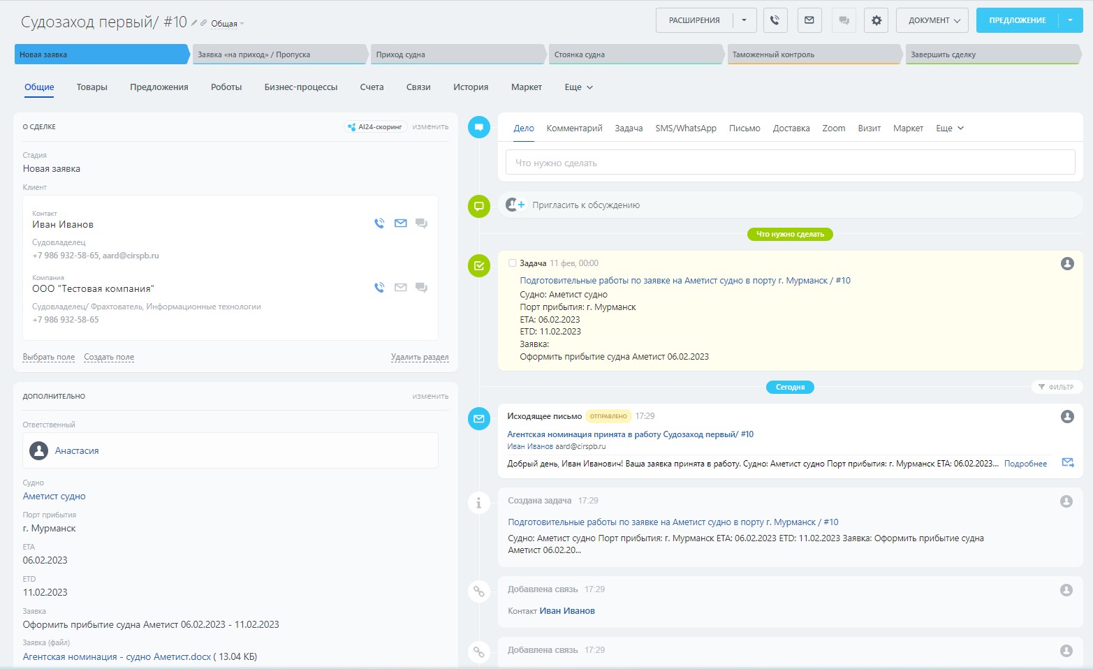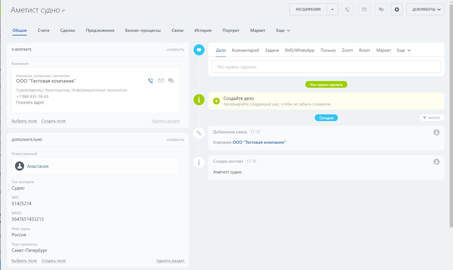 - Судно - это не просто контакт, это важная сущность в работе судового агента. В карточке Судна настроены пользовательские поля IMO и MMSI, помогающие точнее их идентифицировать.