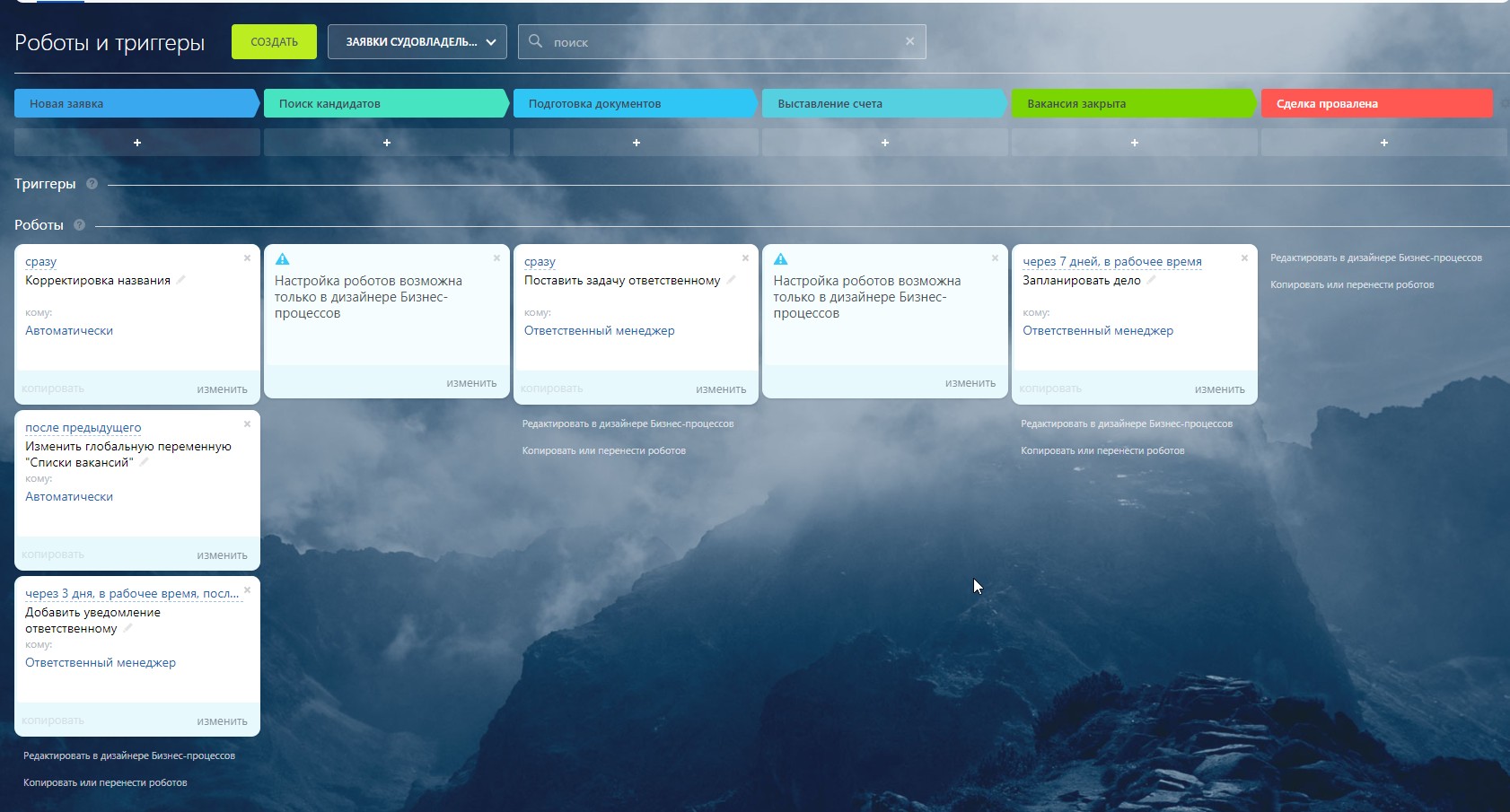 - из воронки Заявки судовладельцев: автоматический поиск подходящий кандидатов из имеющейся базы анкет моряков ***