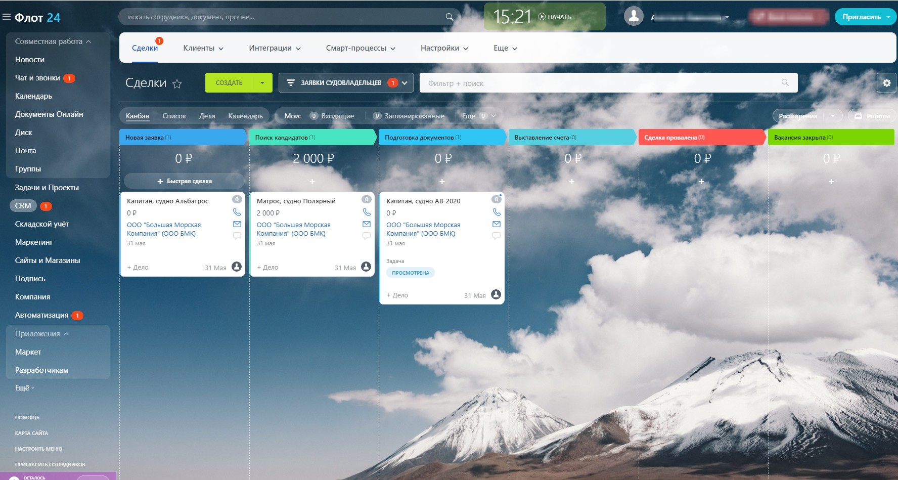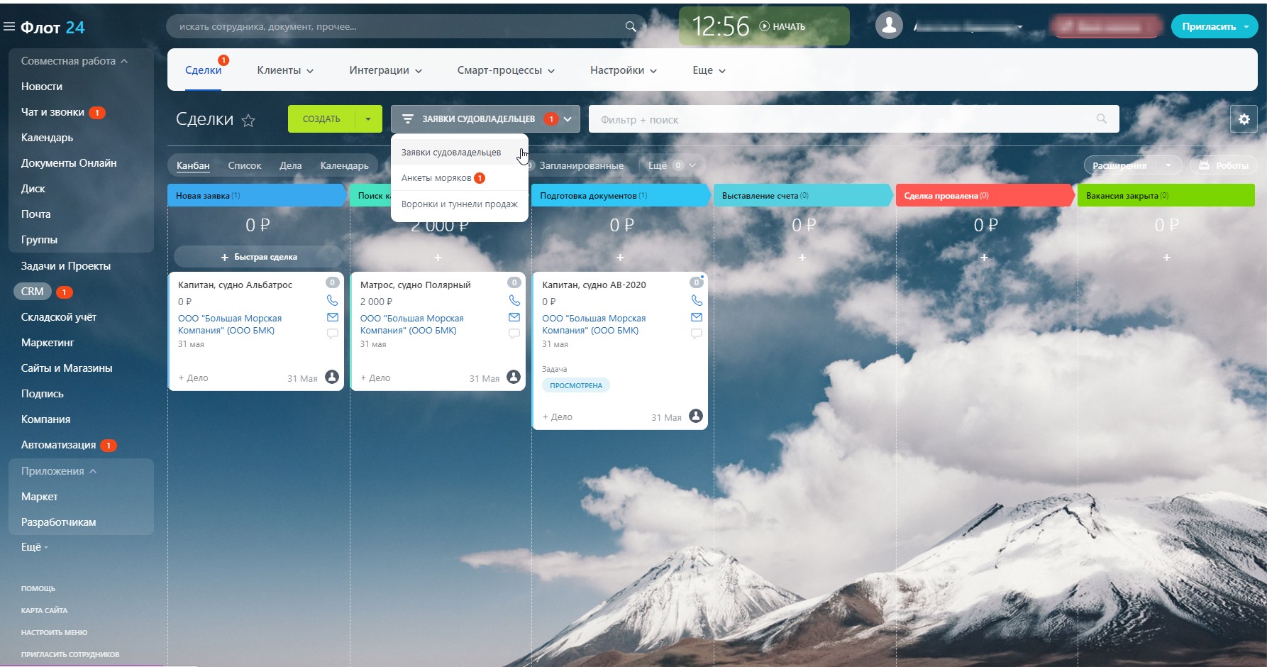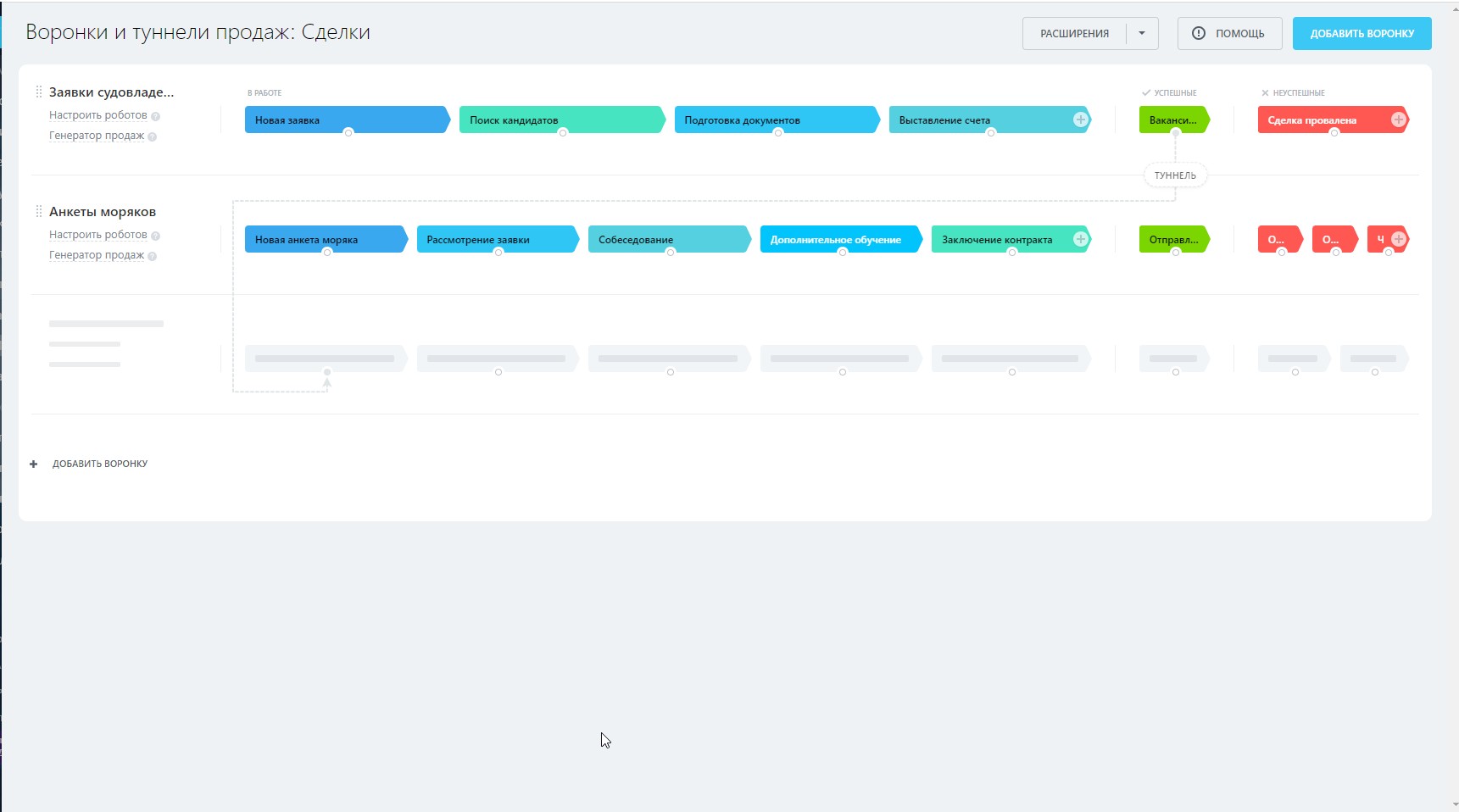 - 2 воронки сделок: Анкеты моряков и Заявки судовладельцев