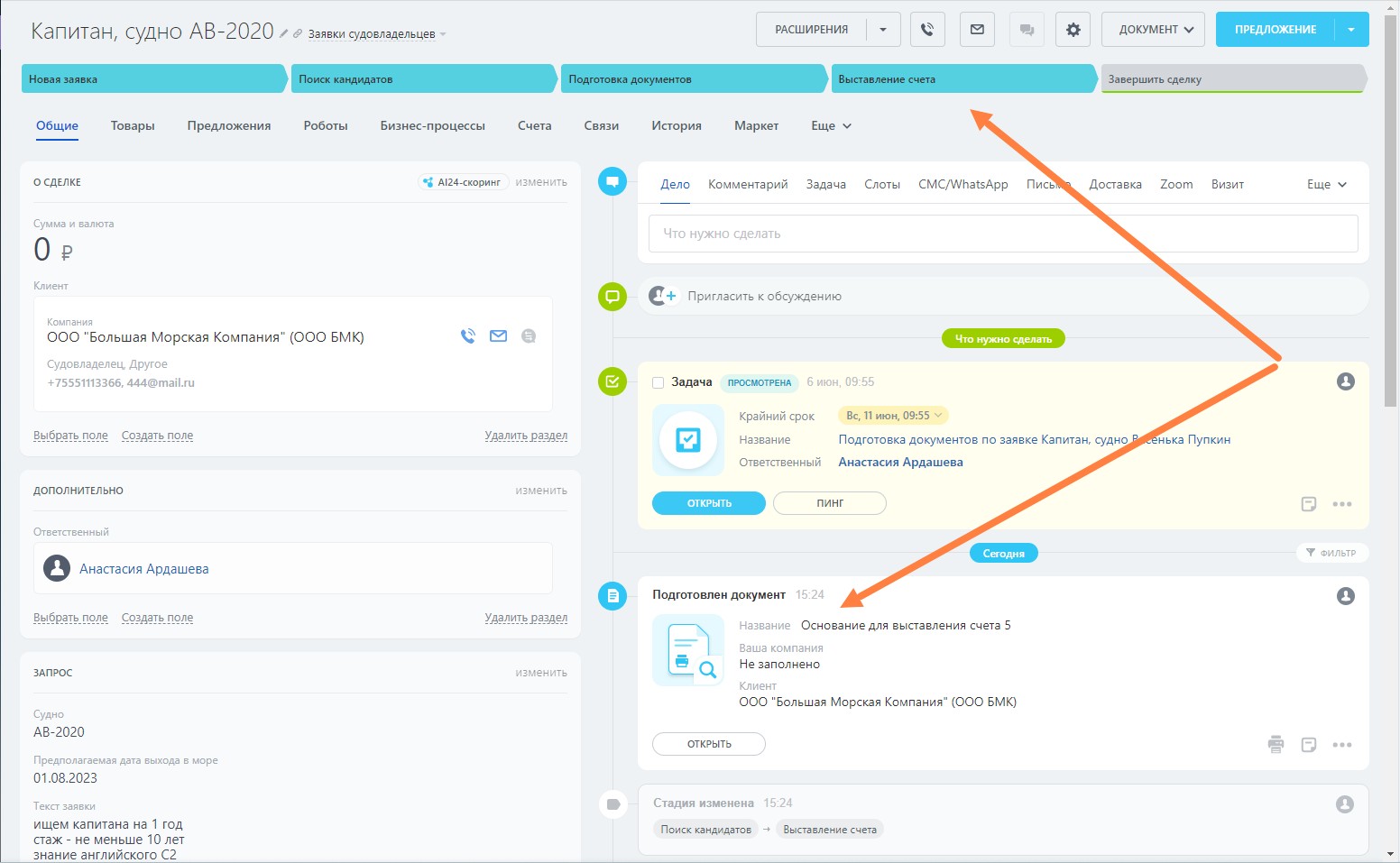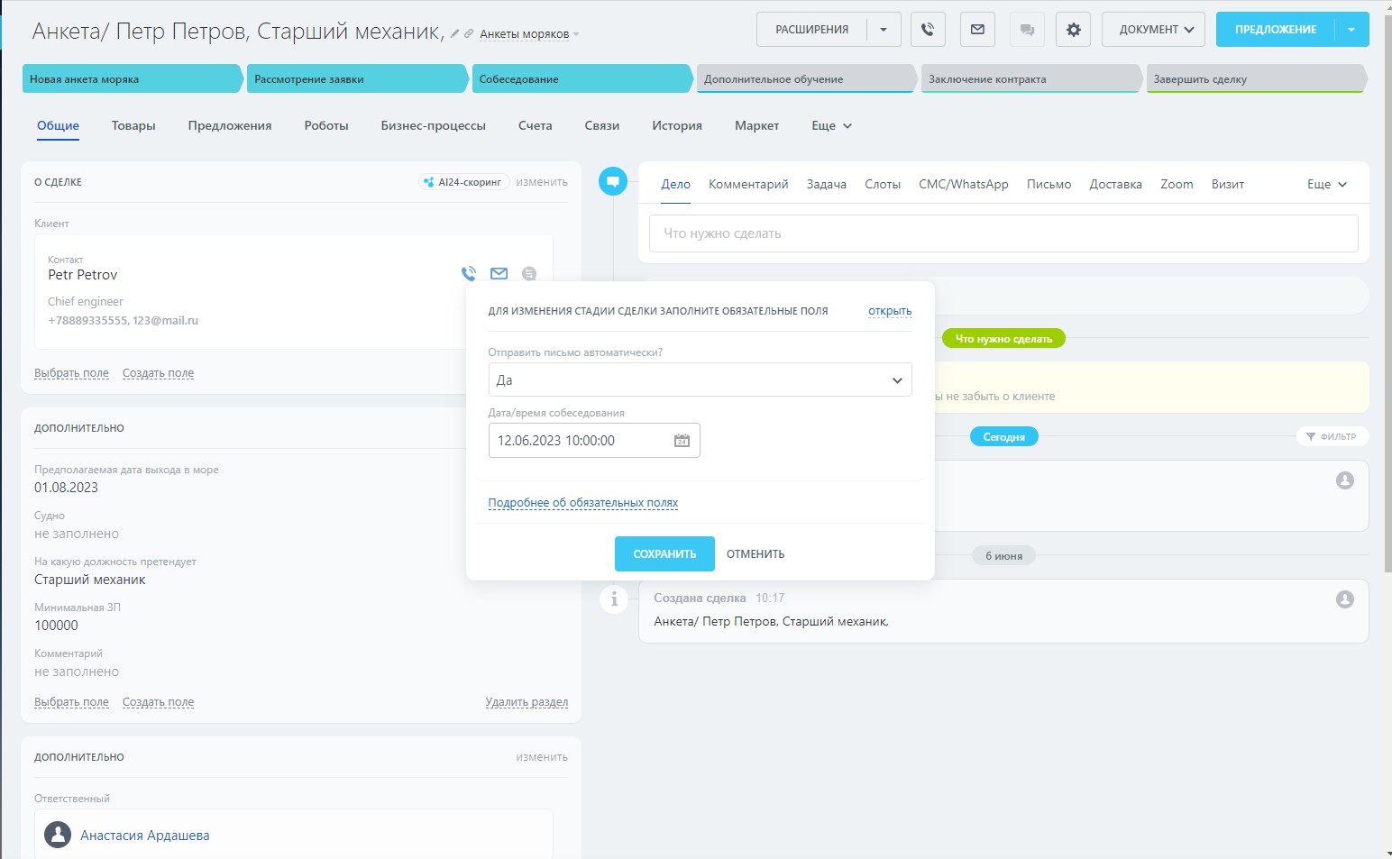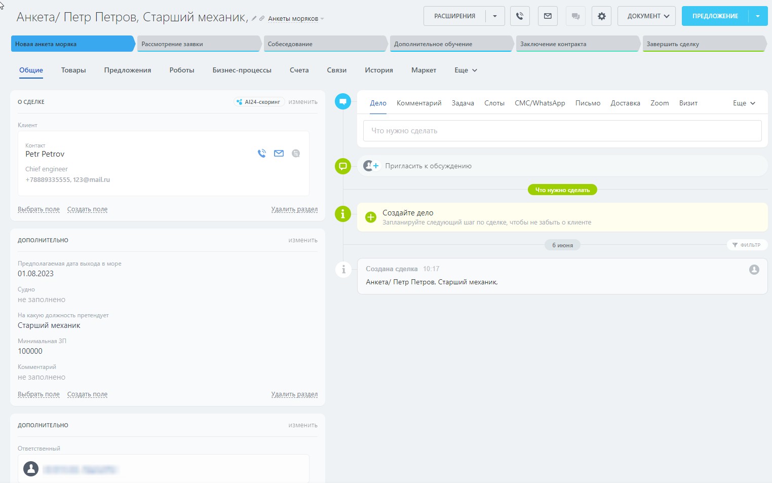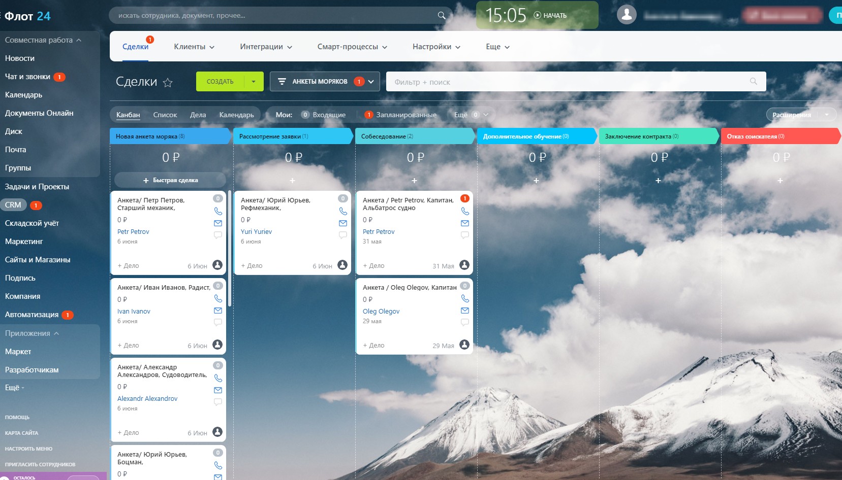 - 2 воронки сделок: Анкеты моряков и Заявки судовладельцев