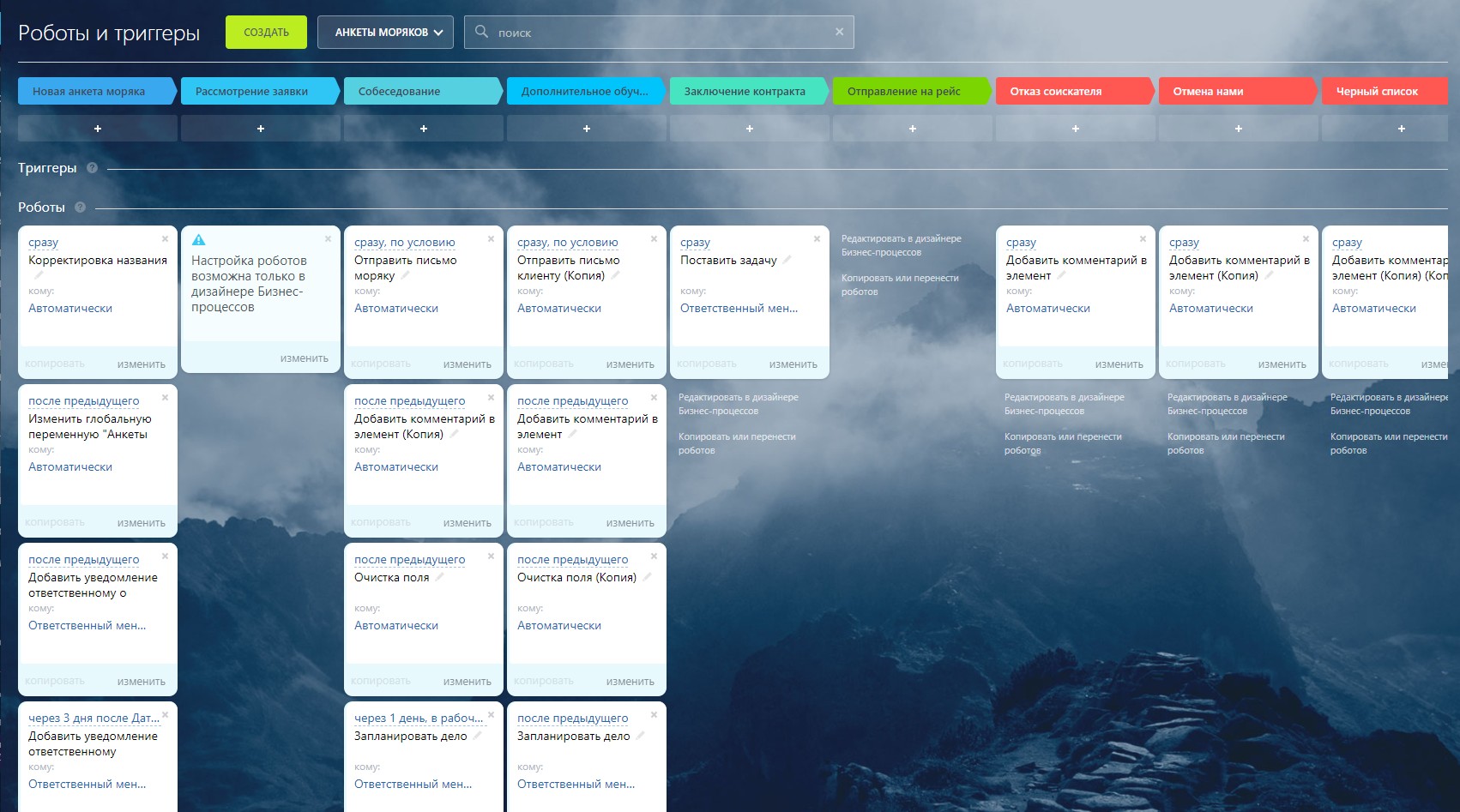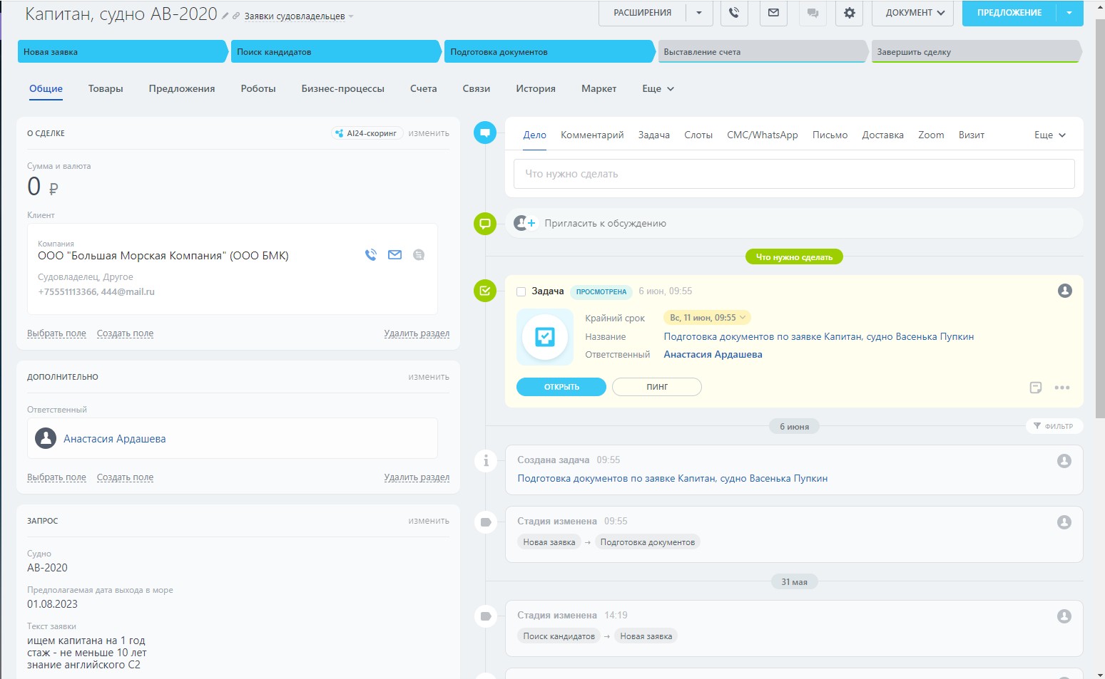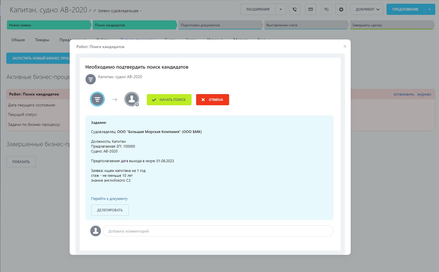 Готовая CRM «Судовой крюинг» для автоматизации рабочих процессов в сфере найма моряков на суда. Подробнее в описании решения.