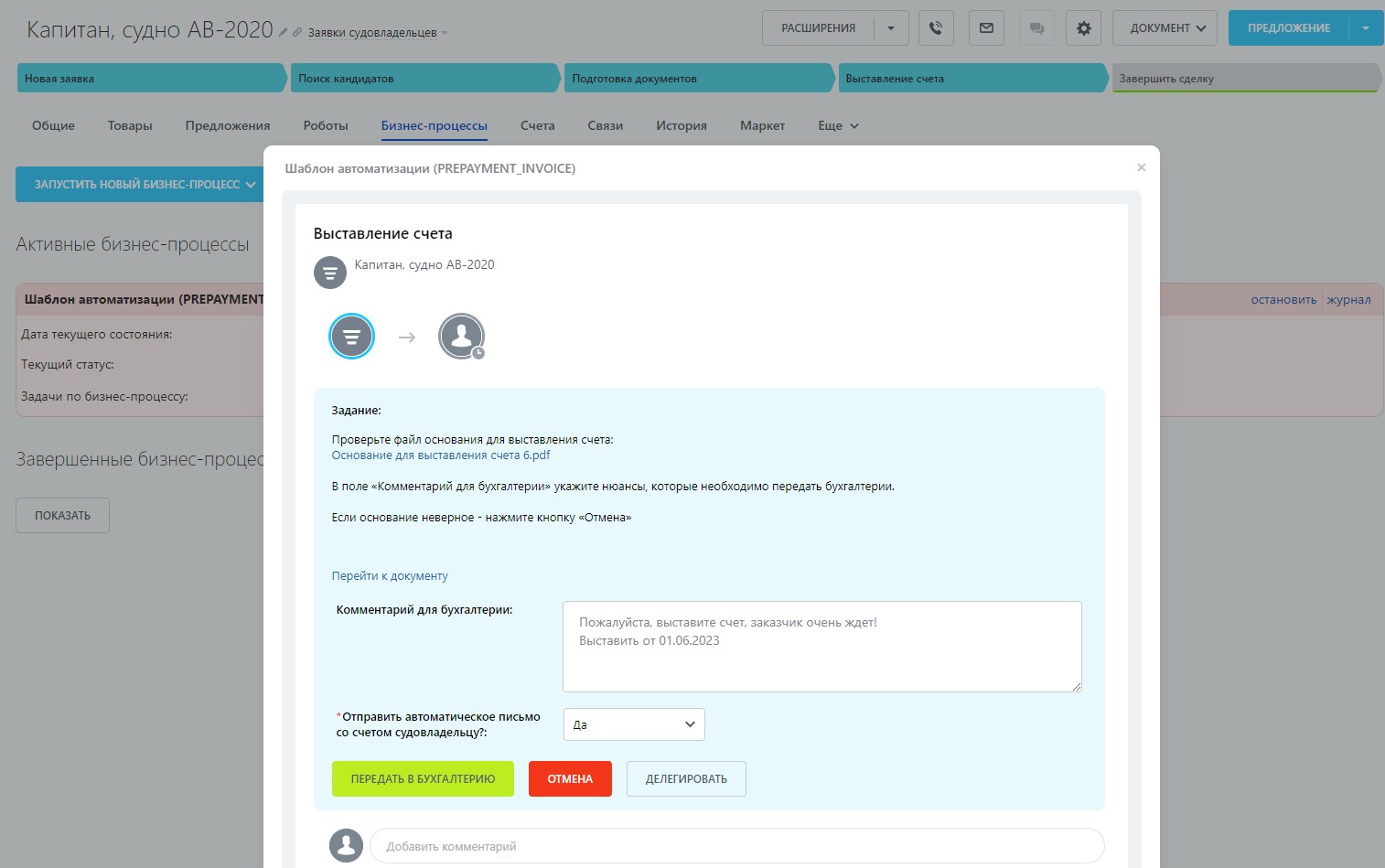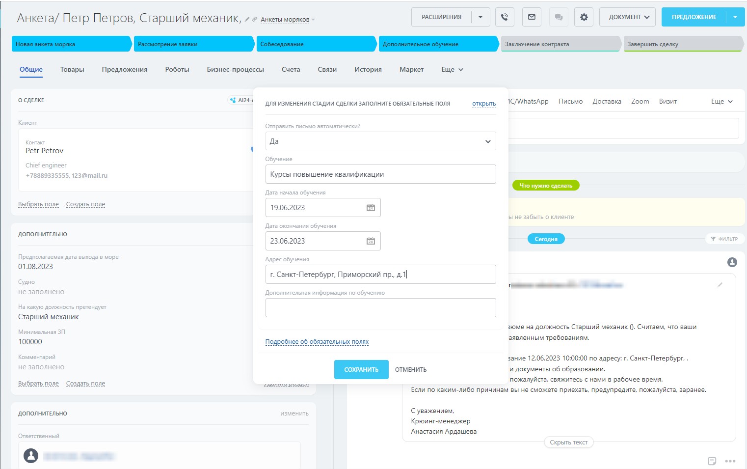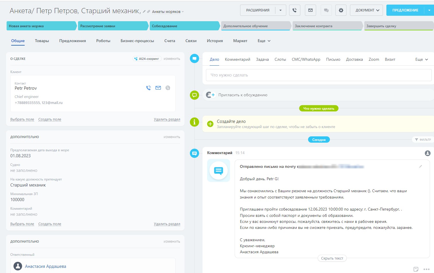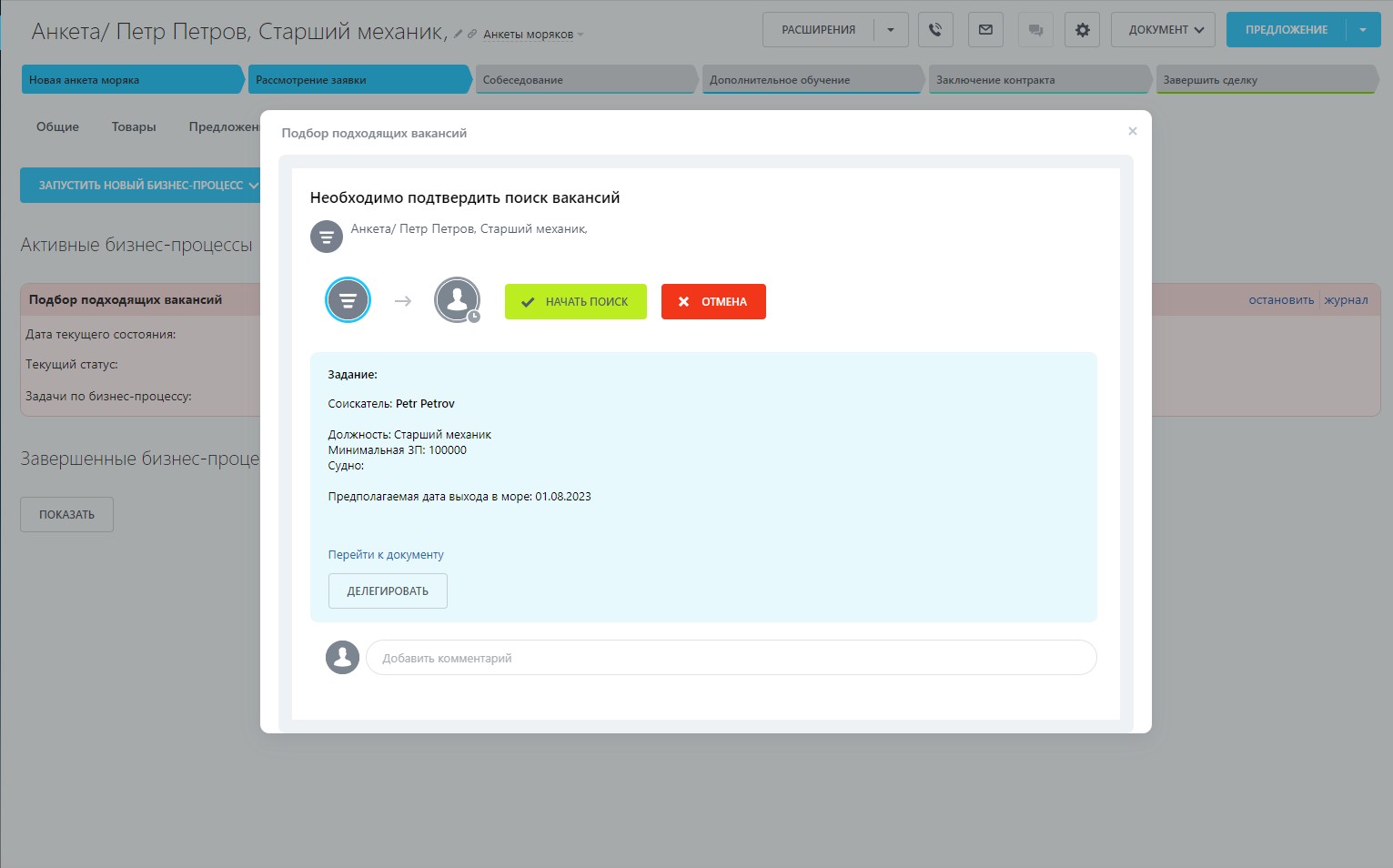 Готовая CRM «Судовой крюинг» для автоматизации рабочих процессов в сфере найма моряков на суда. Подробнее в описании решения.