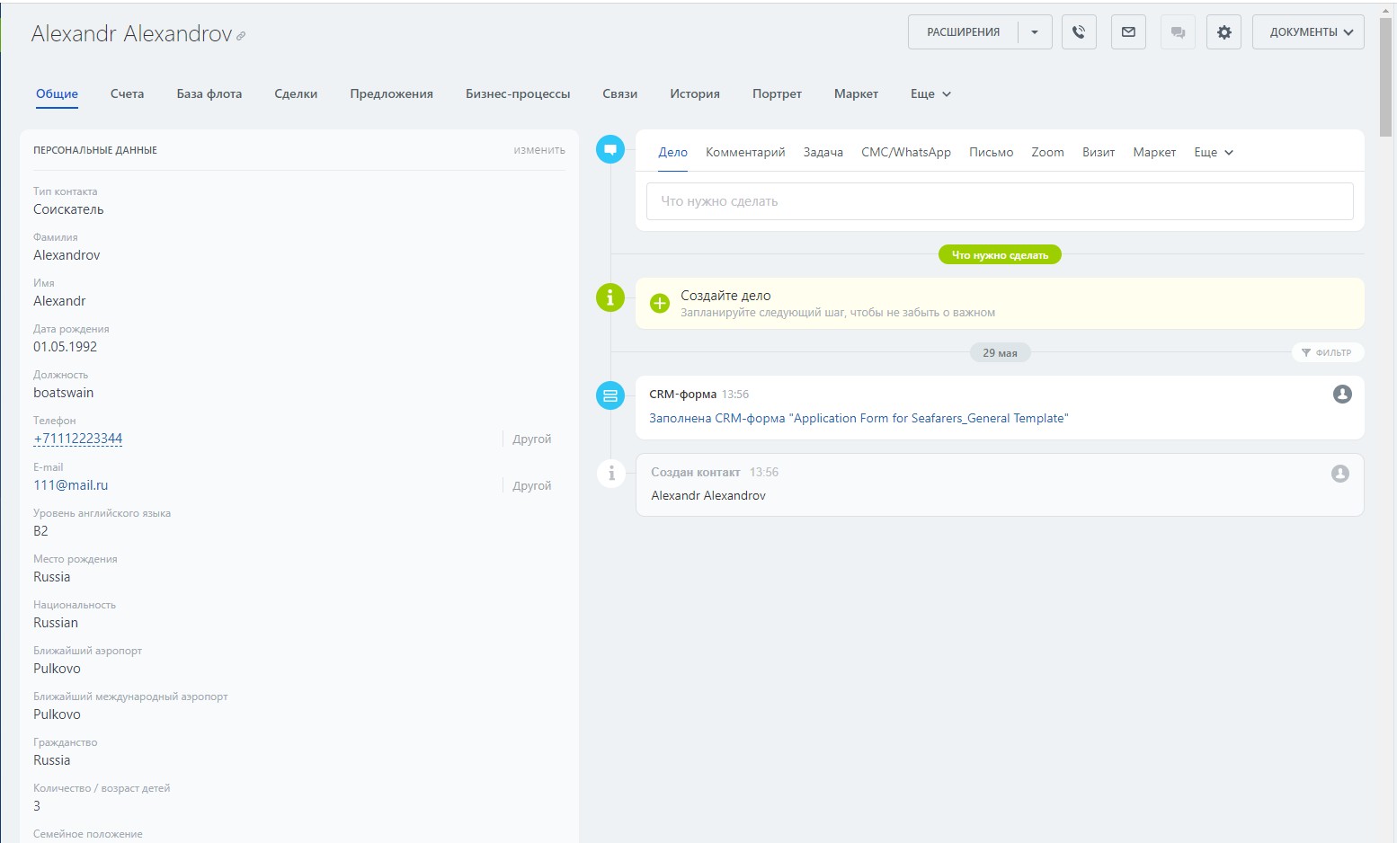 - Анкета моряка - удобная мобильная CRM-форма, которую соискатель заполнит за 5 минут! На основе введенных данных в базе создастся карточка моряка, а также заявка на поиск подходящей вакансии.