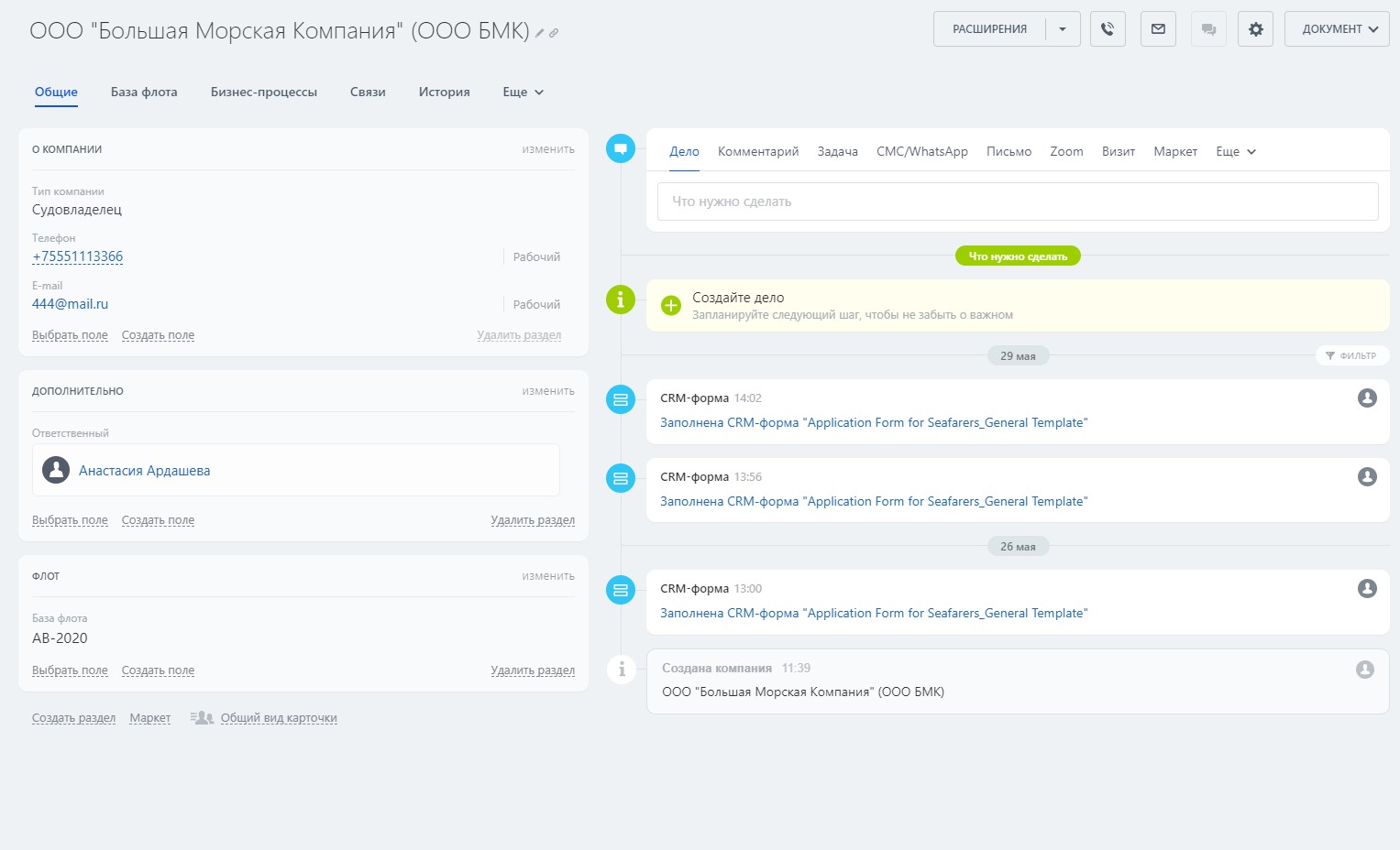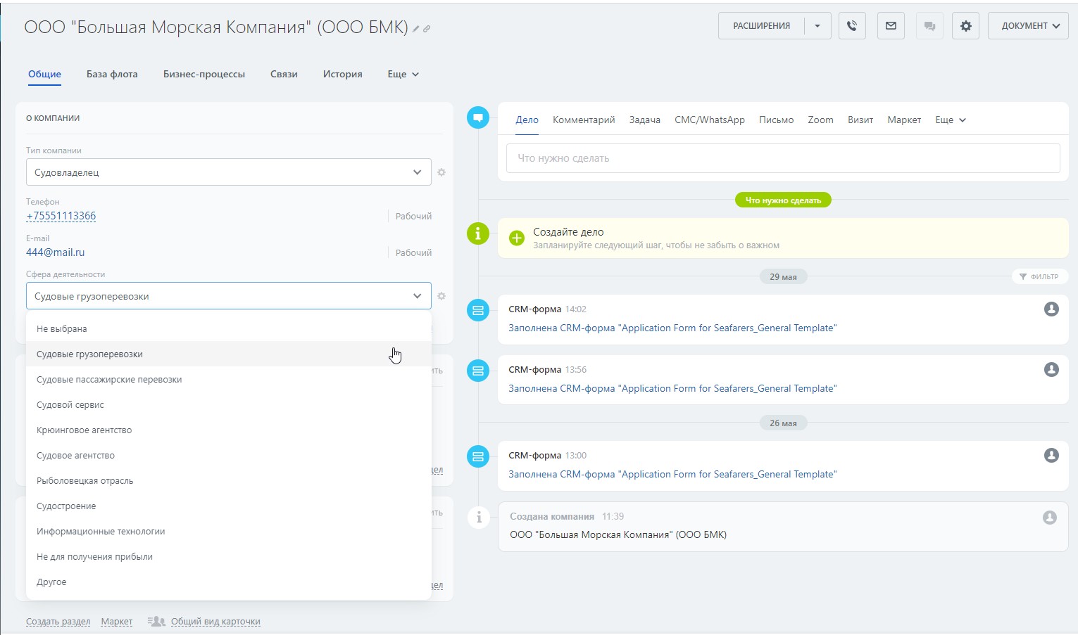 Адаптированы поля под судового агента, такие как Сфера деятельности, Тип контакта и Тип компании.