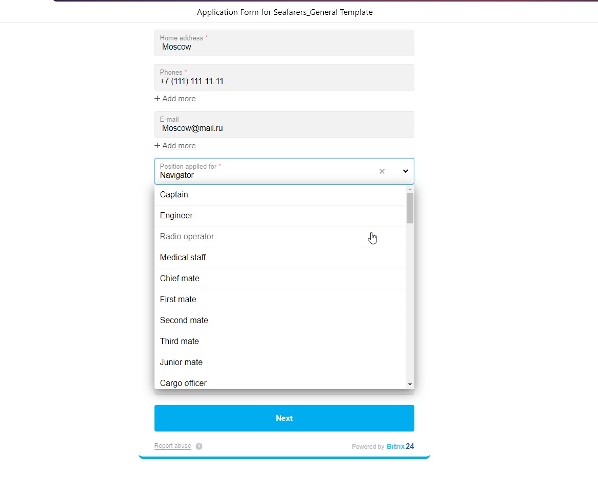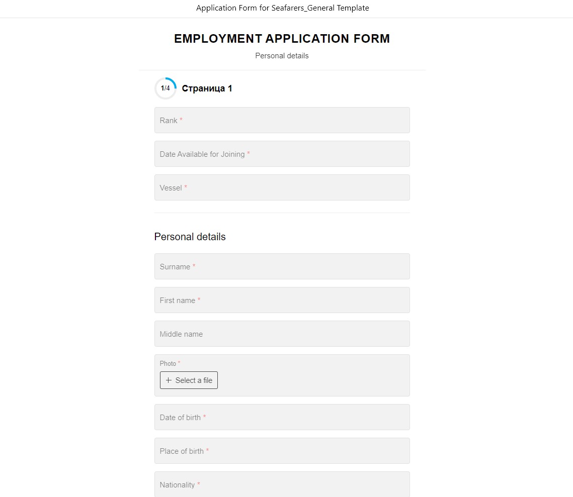 Удобная электронная анкета, которую соискатель заполнит за 5 минут как с ПК, так и с мобильного телефона. Ссылку на CRM-форму вы можете отправить в личные сообщения моряку, или разместить на своем сайте.
