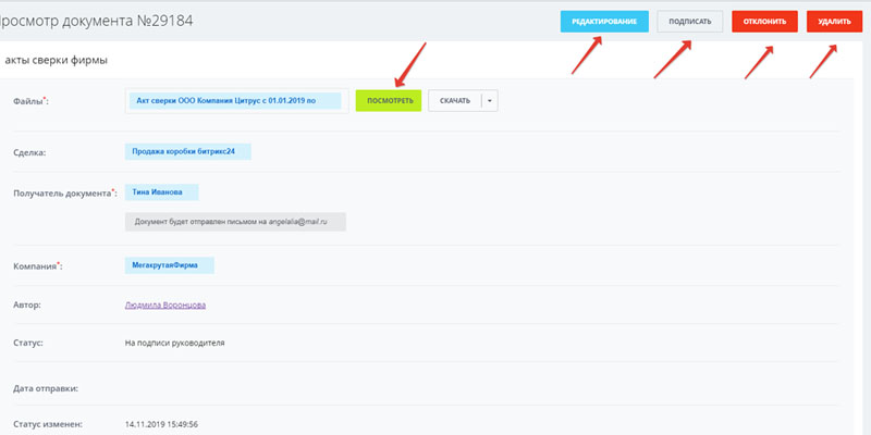 Руководитель получает уведомление, что ему прислали документ. Он может ознакомиться и подписать его своим сертификатом КЭП