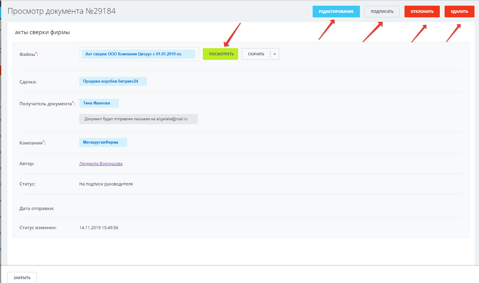 На почту контрагенту приходит уведомление о том, что необходимо подписать документ. Контрагент может подписать или отклонить этот документ.