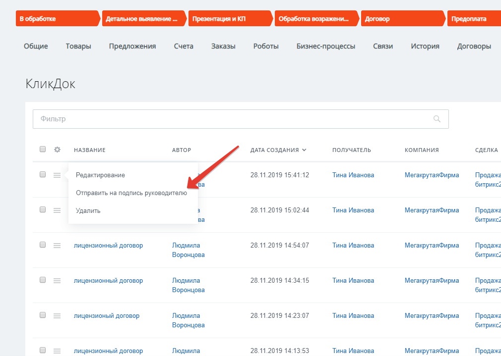 Если вам необходимо настроить бизнес-процессы в компании, автоматизировать работу с документами и покрыть их полный жизненный цикл, включая согласование внутри компании, тогда вам подойдет расширение КликДок — Бизнес-процессы.