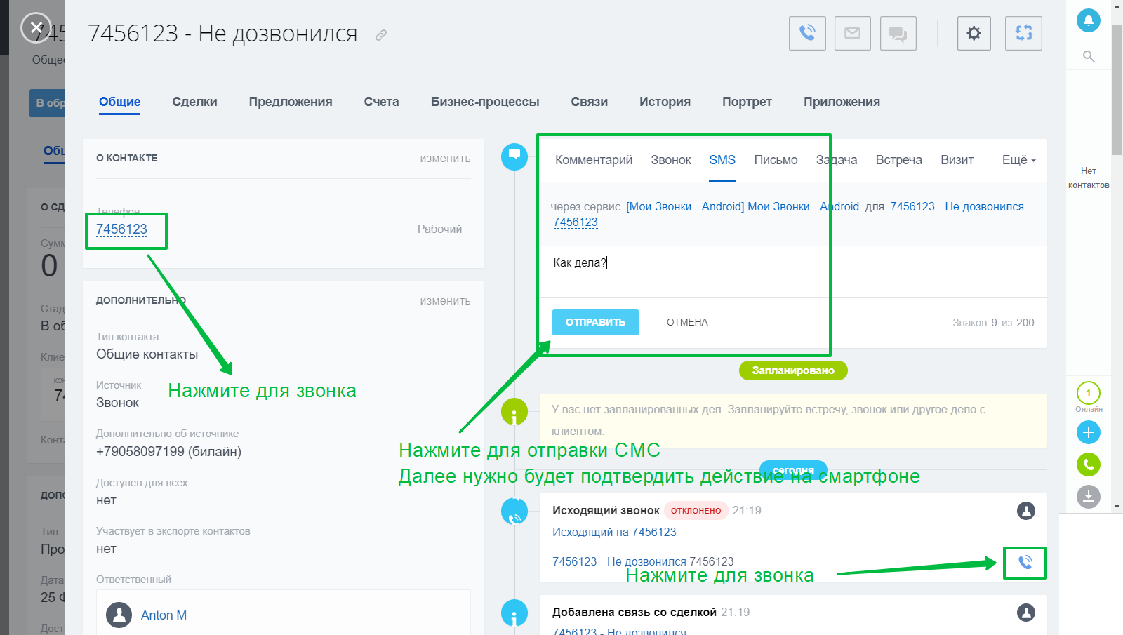 Вы можете нажать на номер телефона клиента в Bitrix24 и телефон автоматически начнет набирать номер. Звонок будет осуществлен через ваш Android смартфон и плата за него будет взиматься согласно вашему тарифному плану.