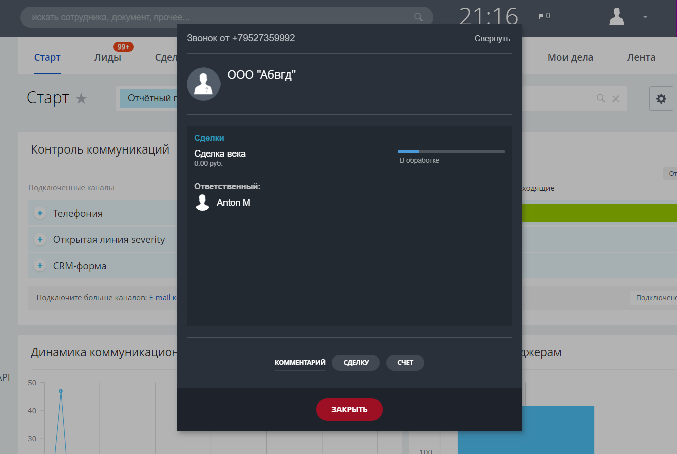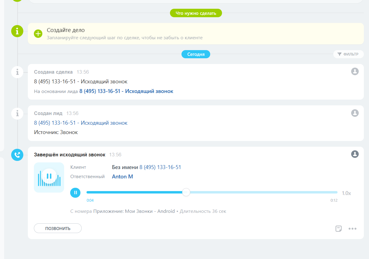 - Автоматическое прикрепление звонка к карточке контакта, компании или лида.