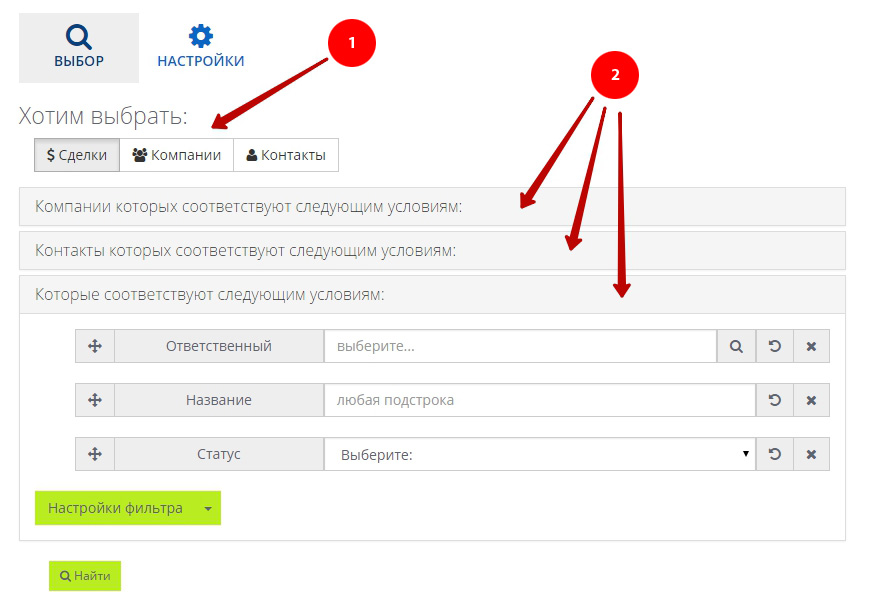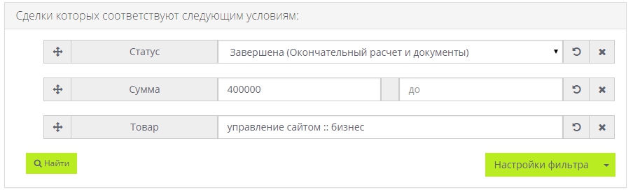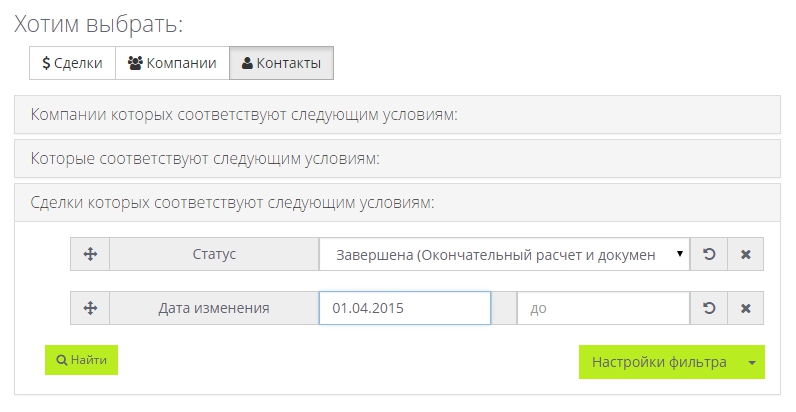 Более того, CRM+ дает возможность фильтрации связанных данных в CRM. Если штатными средствами вы можете отобрать по некоторым условиям только отдельно сделки, отдельно компании и отдельно контакты, то CRM+ поможет вам получать из данных CRM правильные с точки зрения бизнеса выборки. Например, вы легко сможете получить результат для запроса вроде "все сделки, на сумму более 100 000 заключенные с компаниями, работающими в сфере сельского хозяйства конкретного региона".