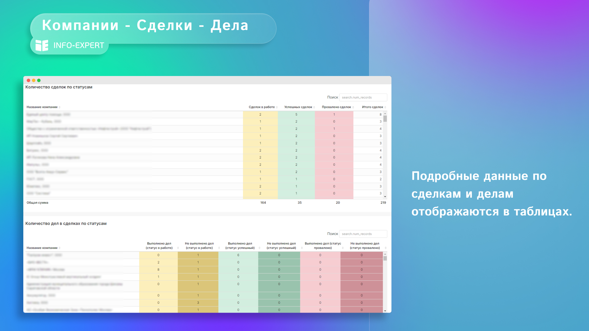Быстрый анализ общих показателей по Сделкам и Делам в разрезе Компаний.