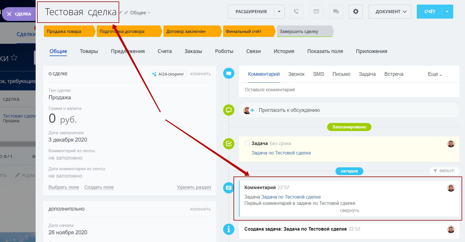 Теперь, как только в задаче, привязанной к любому из элементов CRM, будет добавлен комментарий, эта информация копируется в таймлайн Лида / Контакта / Компании / Сделки / Заказа.
