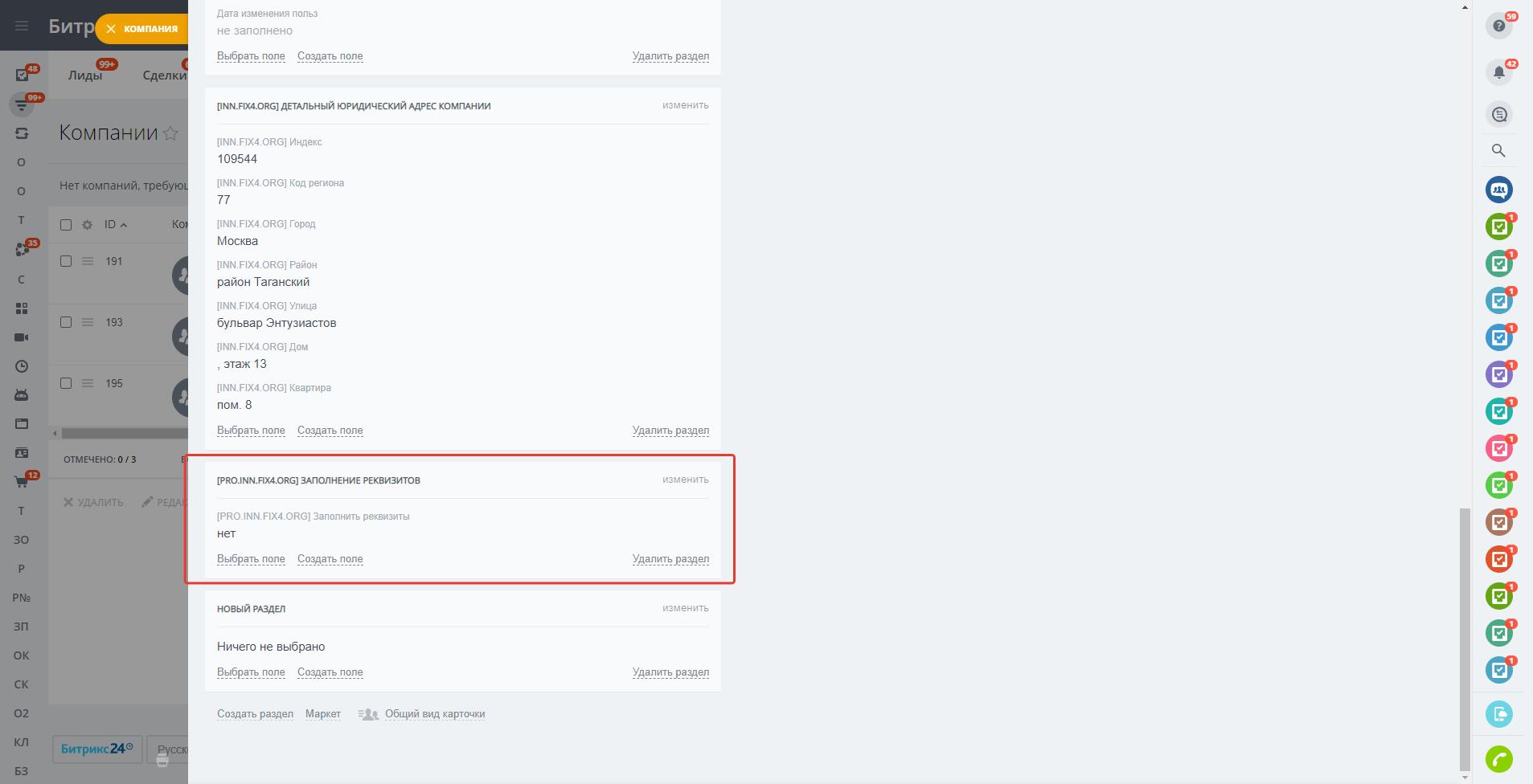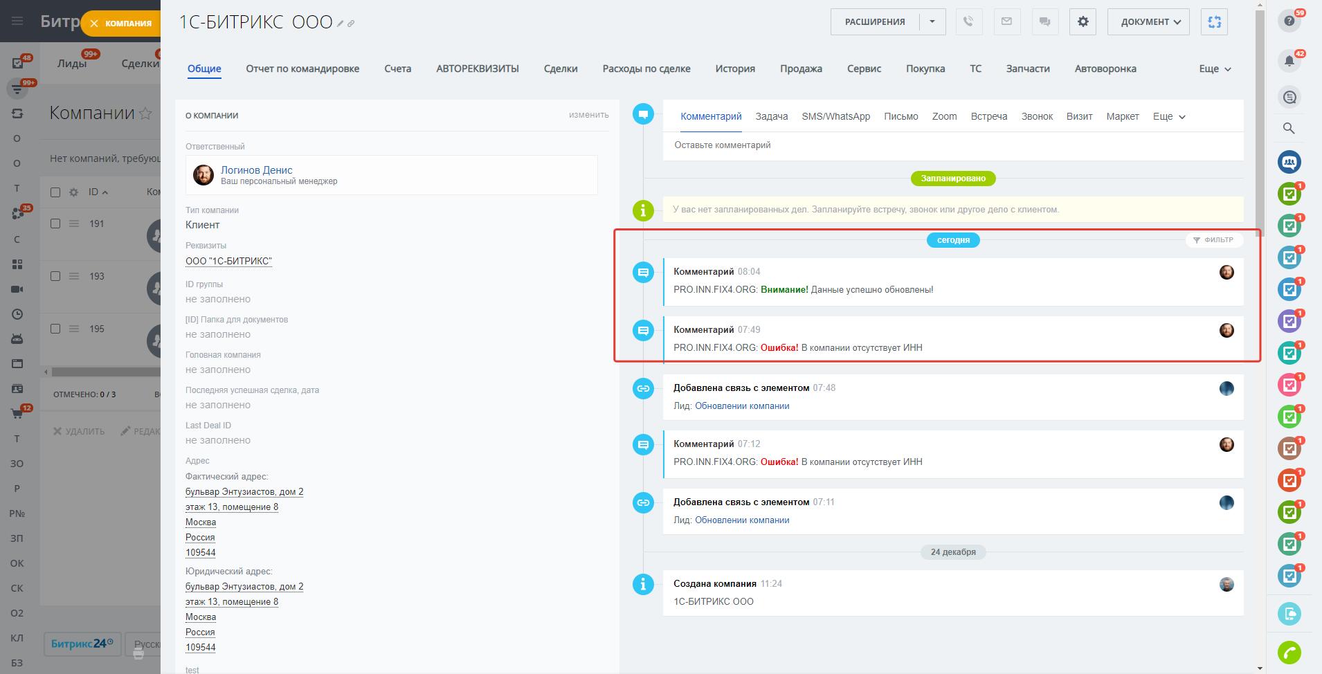 - Проводить массовое обновление реквизитов компаний в Битрикс24.CRM