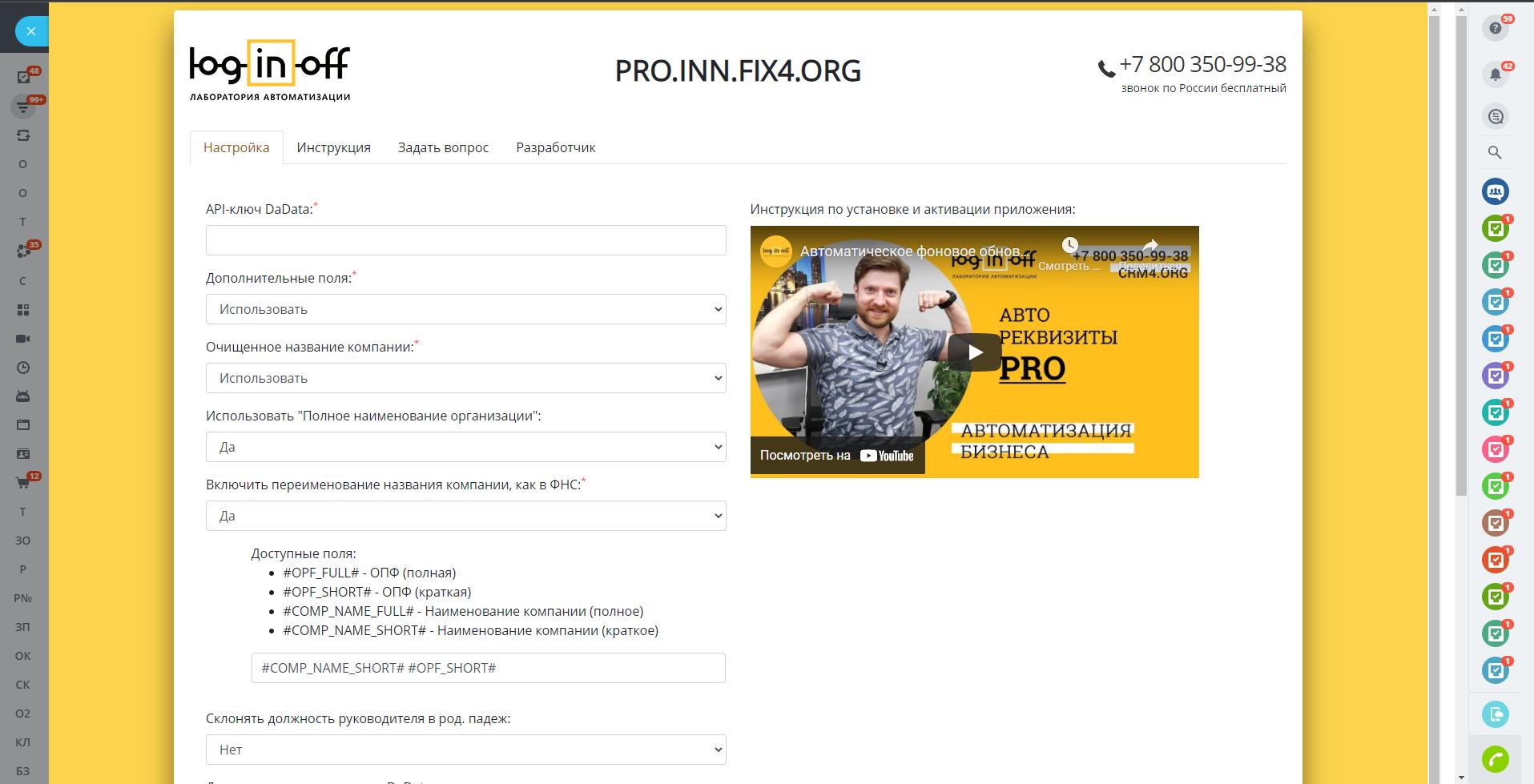 Приложение для автоматического быстрого заполнения реквизитов компаний в фоновом режиме 24/7/365. Достаточно указать ИНН в название компании или реквизиты и поставить галочку. Дополнительно: Может устанавливать название компании согласно данным ФНС, записывает точное наименование должности руководителя компании, для использования в генераторе документов CRM, записывает красивое написание инициалов руководителя, получает точный юридический адрес компании, получает город и еще более десятка параметров компаний.