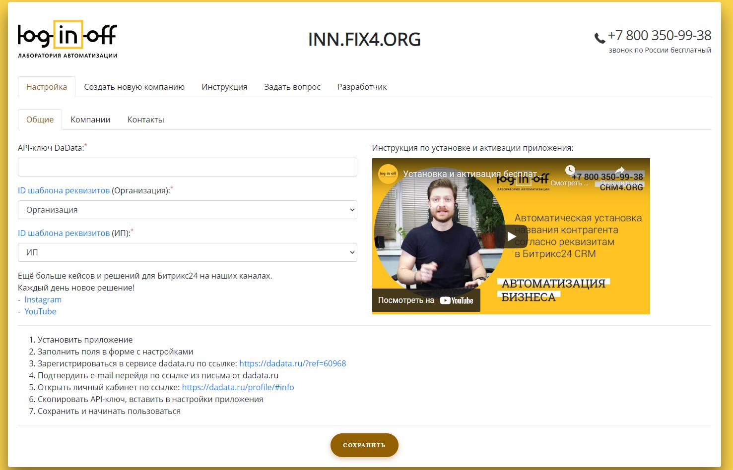 Приложение «Быстрое заполнение реквизитов компаний и банка [INN.FIX4.ORG]» помогает Битрикс24 наполнять карточки данными компаний по названию компании или по ИНН как новых, так и уже находящихся в базе данных компаний. При использовании отпадает необходимость заполнять вручную поля реквизитов компании, что сокращает время заполнения карточки и исключает возникновение ошибки заполнения по причине человеческого фактора. Все поля заполняются в полном соответствии с требованиями официальной переписки и не требуют корректировки.
