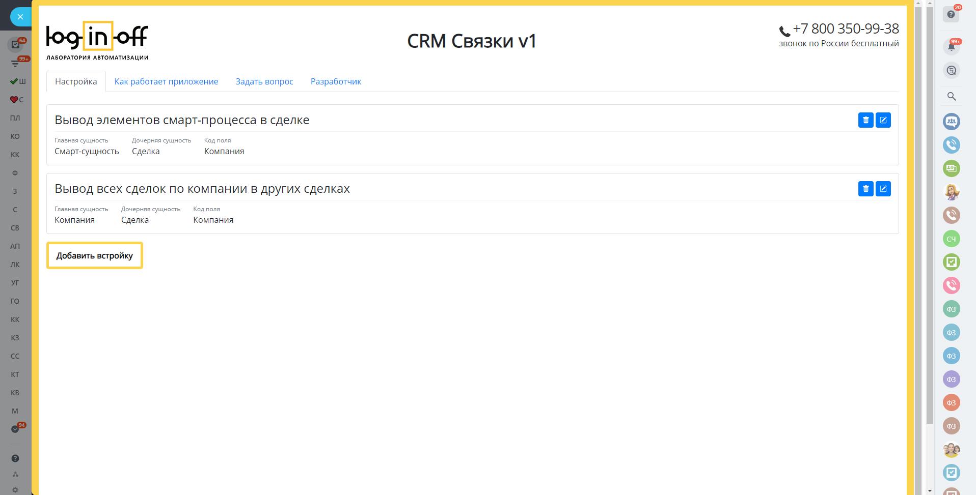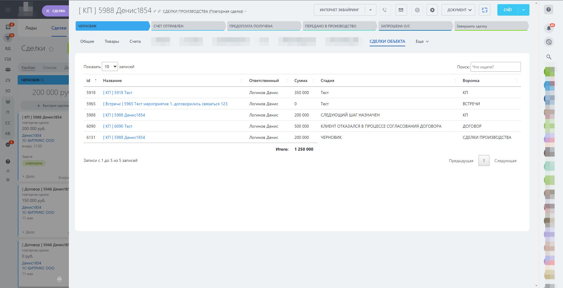 - Позволяет просмотреть связанные сущности прямо из карточки CRM. Например, в карточке сделки "Договор" можно увидеть список всех связанных сделок по исполнению обязательств.