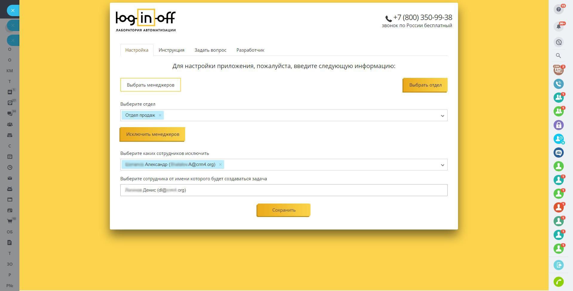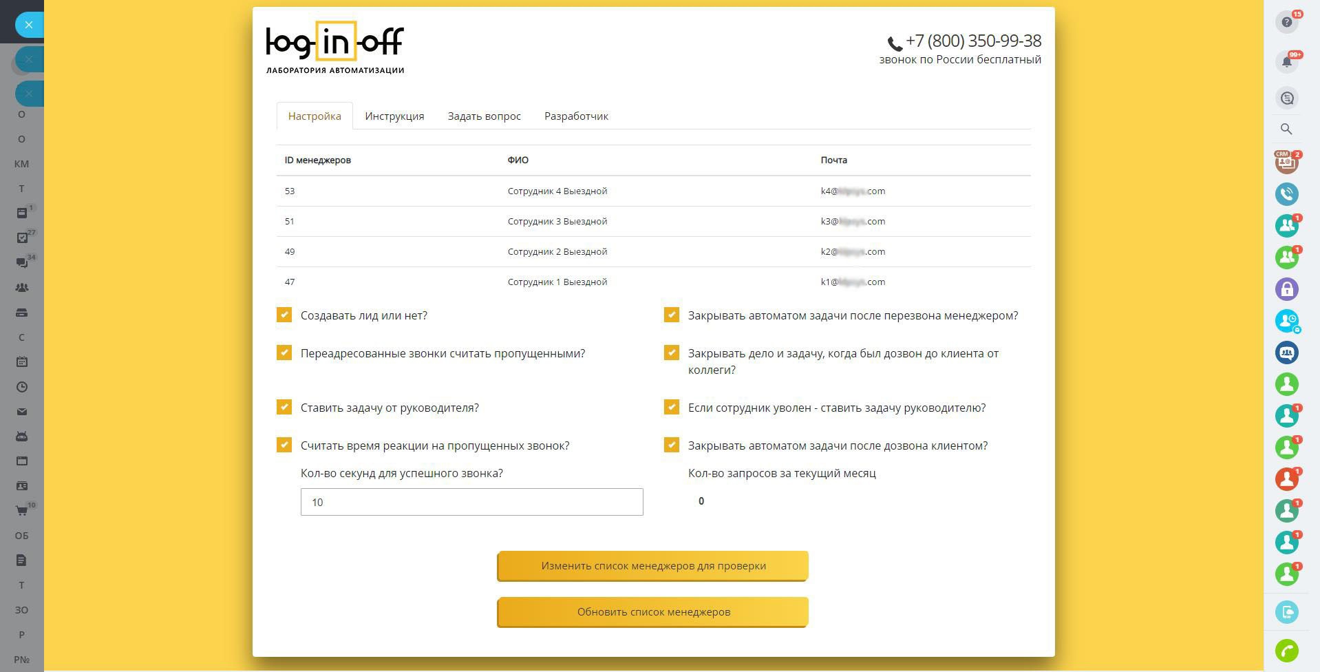 - Автоматически закрывать дела и задачи о пропущенных звонках