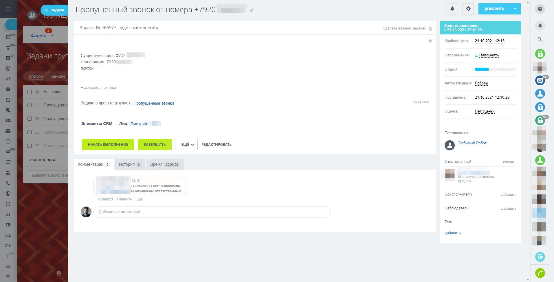 Приложение реагирует на сигнал о том, что был зафиксирован пропущенный звонок и в течение нескольких секунд создаёт задачу в специальной группе «Контроль пропущенных звонков».