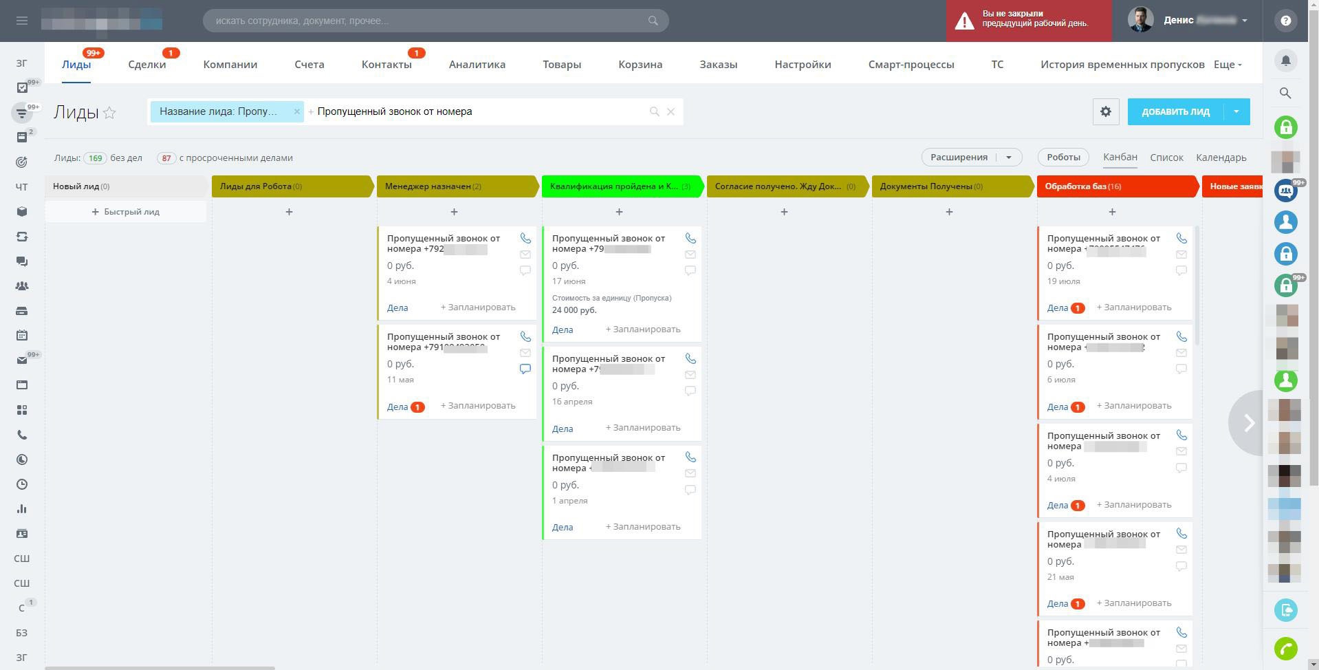 - При пропущенных звонках штатным функционалом ставятся дела, которые нужно закрывать менеджерам вручную и которые копятся в счетчиках дел